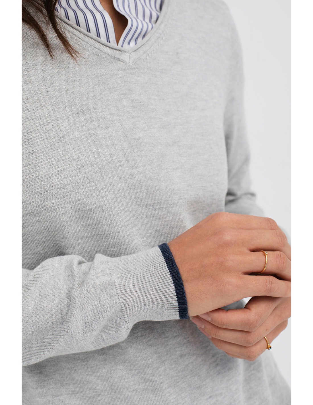 Pull basique en tricot à manches longues et col en V. Les poignets et le bas sont dotés d'un élégant bord contrasté, ce qui lui confère un style moderne et sophistiqué. Se combine parfaitement avec le pantalon Naka.