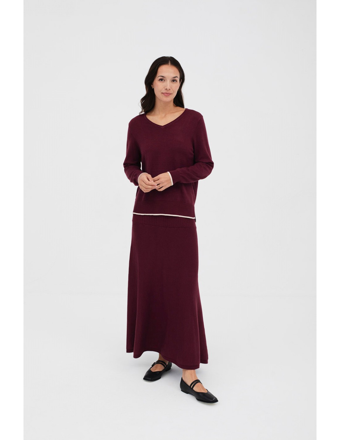 Pull basique en tricot à manches longues et col en V. Les poignets et le bas sont dotés d'un élégant bord contrasté, ce qui lui confère un style moderne et sophistiqué. Se combine parfaitement avec le pantalon Naka.