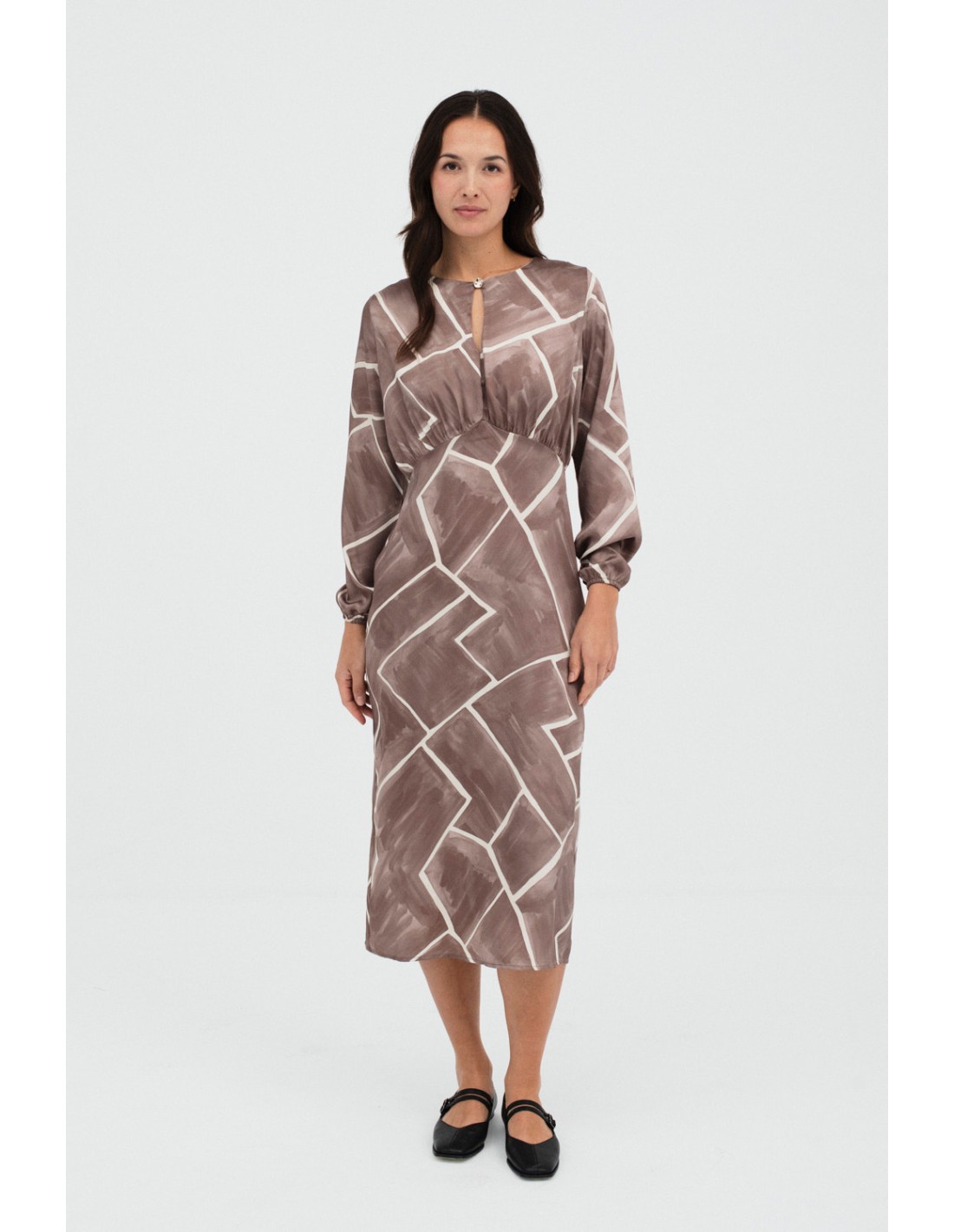 Robe longue imprimée à manches longues, avec un décolleté en forme de goutte et un bouton métallique fantaisie. Elle présente un froncé à la taille et des poignets légèrement bouffants, idéale pour un look romantique.