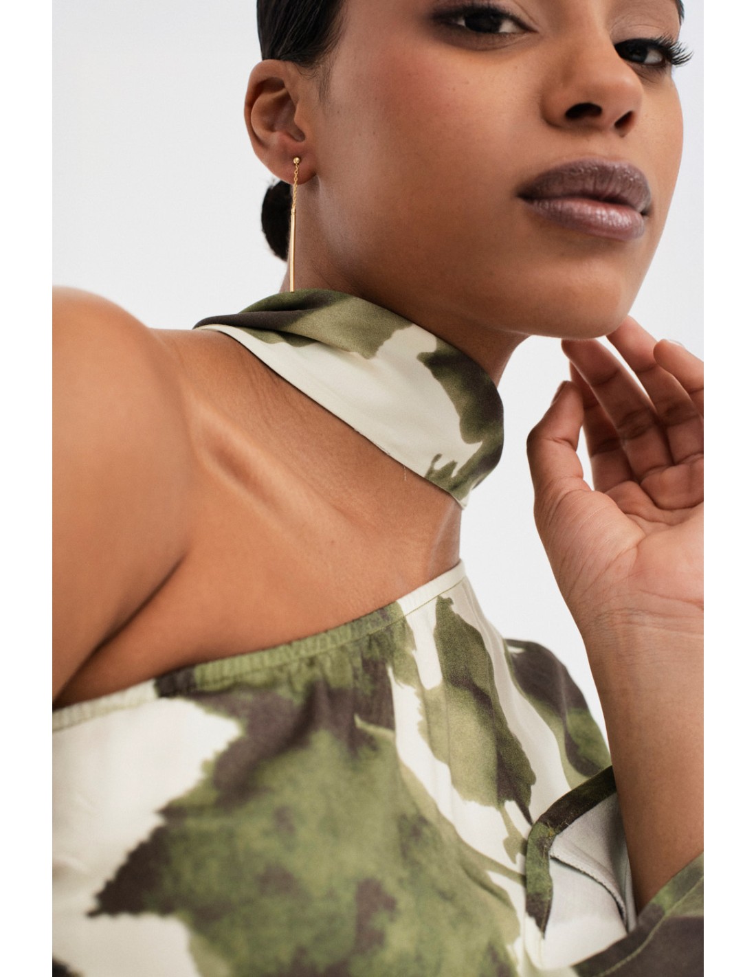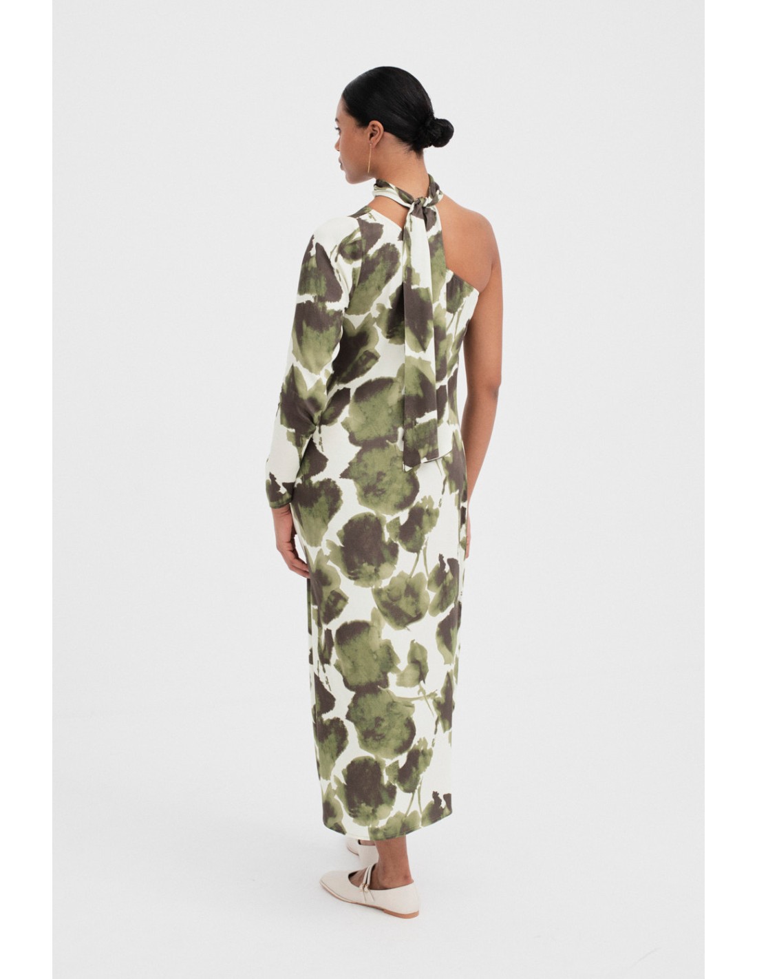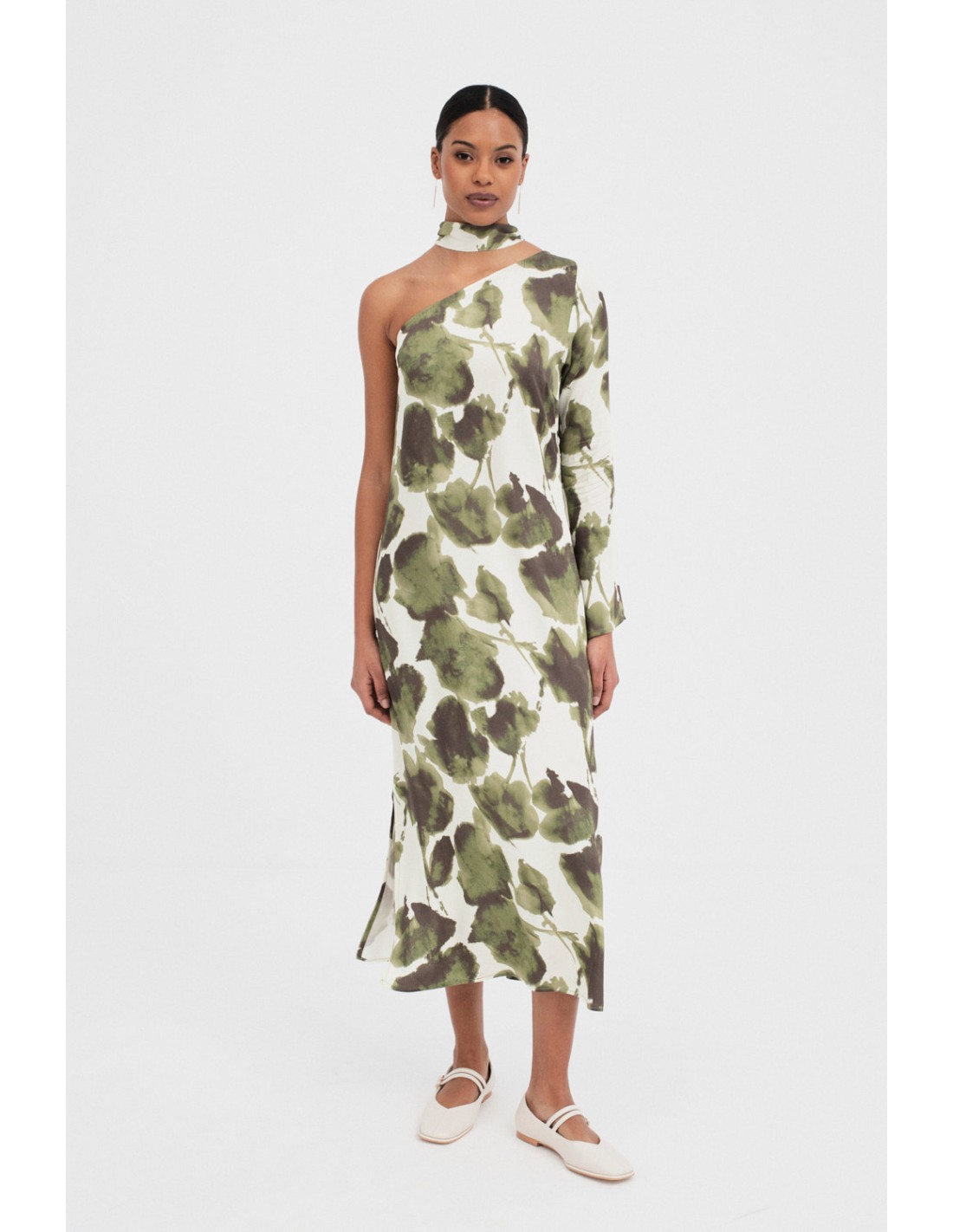 Robe asymétrique avec un imprimé unique. Conçu avec une manche et une fente latérale. Inclut un foulard du même imprimé que vous pouvez transformer en choker pour ajouter une touche élégante. Fermeture avec une fermeture éclair invisible sur le côté.