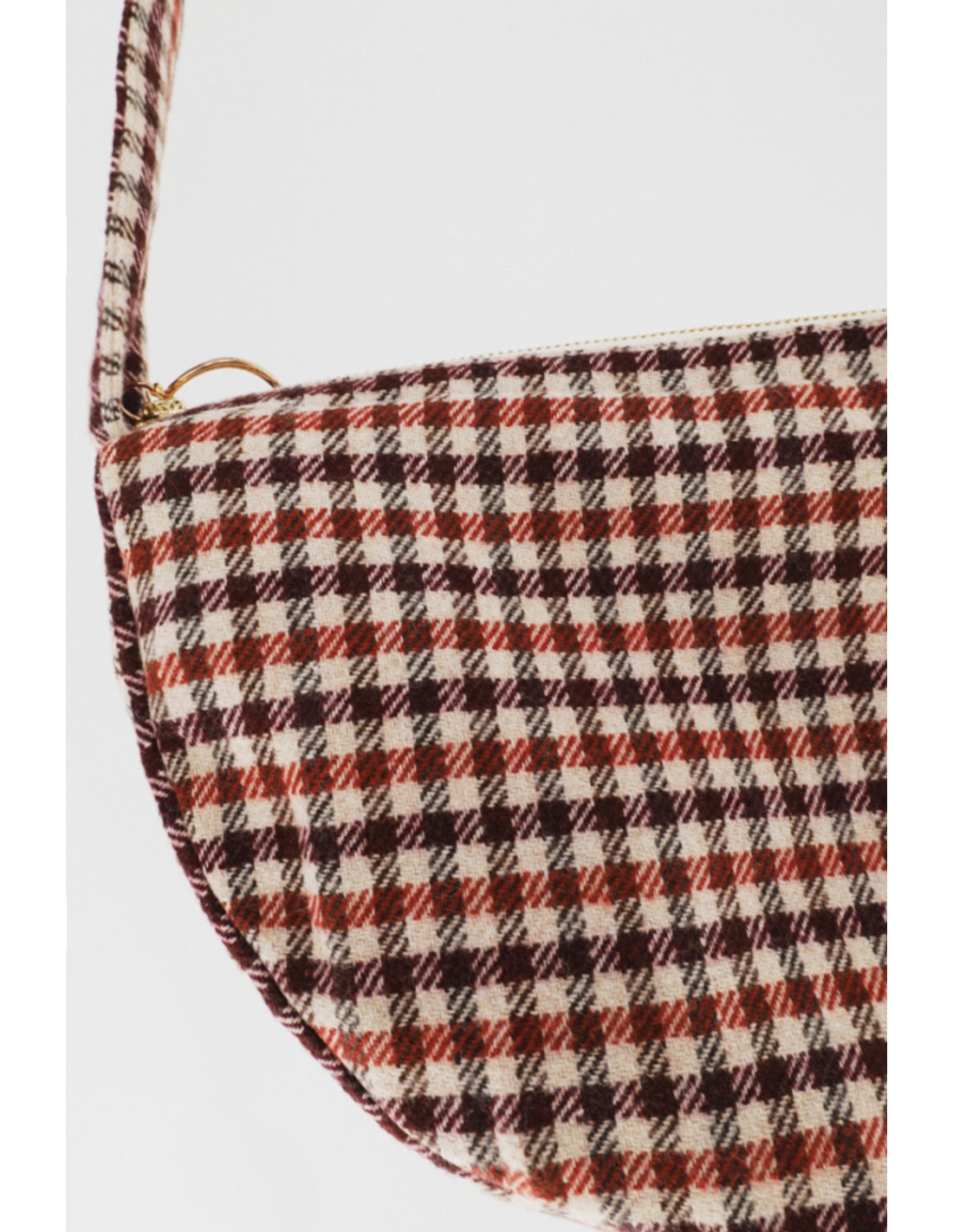 Petit sac en tissu avec anse réglable. Il se ferme avec une fermeture éclair métallique dorée, ajoutant une touche élégante et moderne. Associez-le à la veste Libournais et au pantalon Blayais.