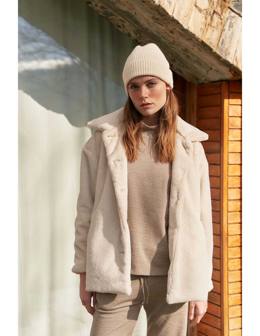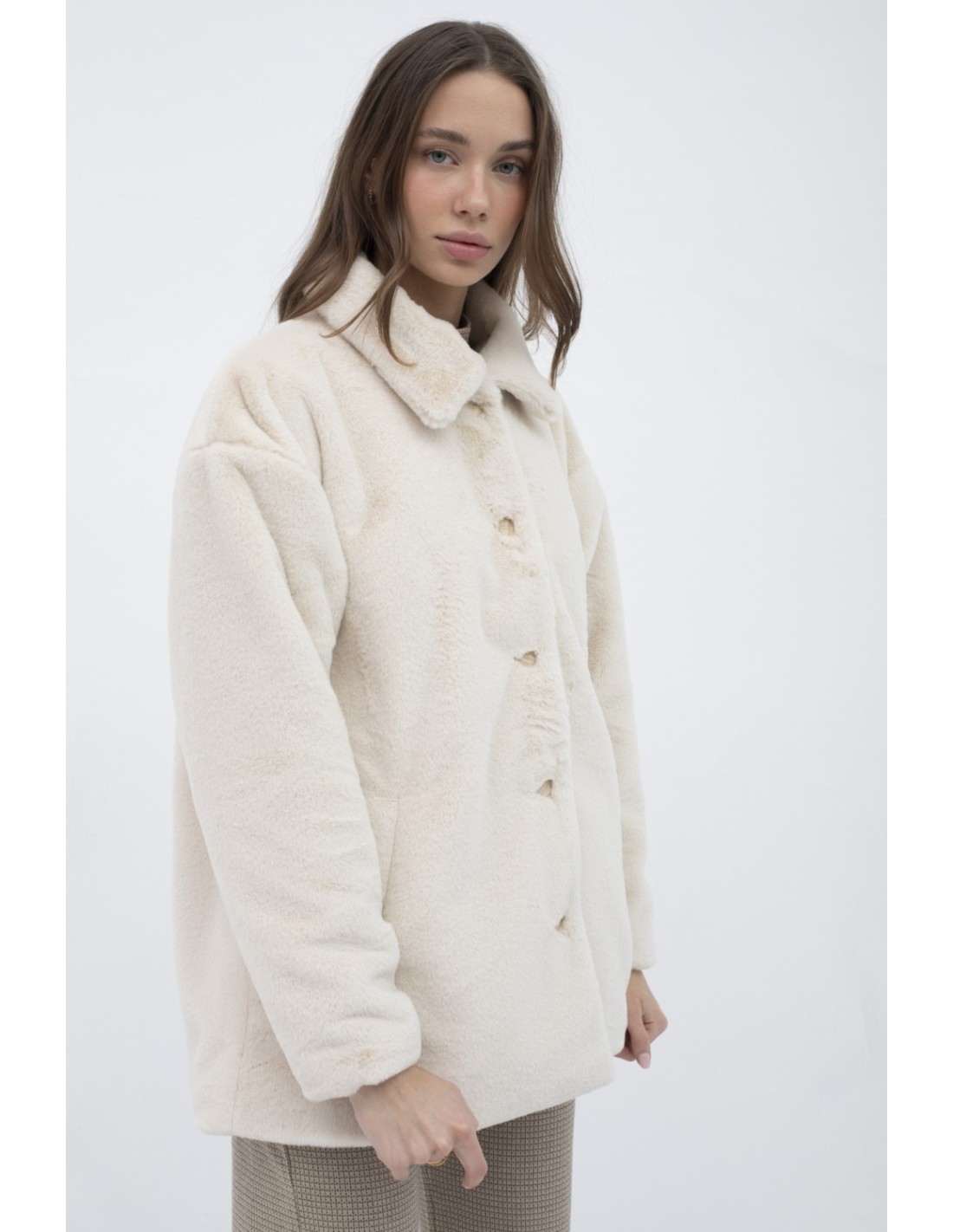 Veste en fourrure avec col en fourrure, fermeture à boutons et poches diagonales, offrant un style moderne et fonctionnel pour compléter votre look avec confort et sophistication.