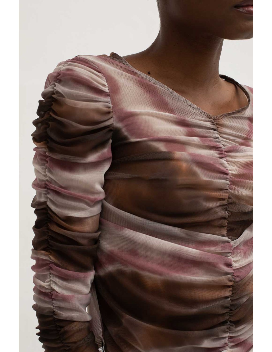 Le t-shirt en tulle imprimé se distingue par ses fronces sur le devant et les manches, un décolleté en V flatteur et un dos non froncé. Nous vous conseillons de l''associer à la jupe en tulle Mazie!