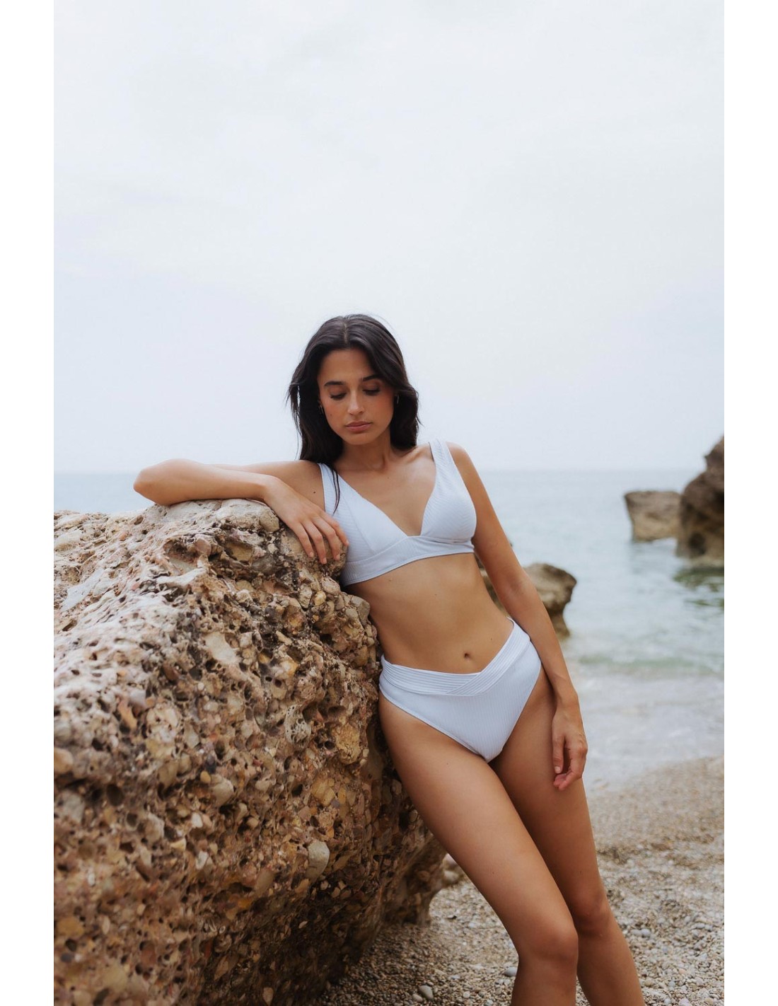 Bikini en tissu côtelé, col en V, larges bretelles et pièce sous poitrine qui se noue dans le dos. La culotte est dotée d'une ceinture croisée sur le devant pour un effet visuel amincissant. Comprend des ouvertures avec mousse amovible.Le modèle porte la taille S.
