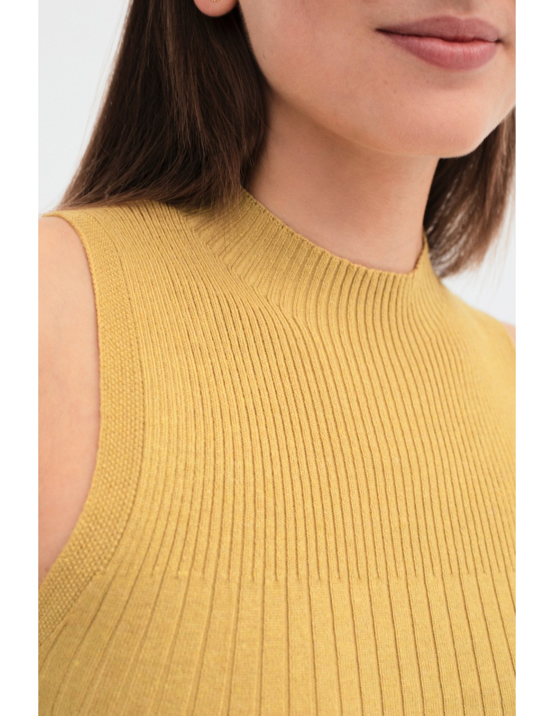 Top en maille sans manches, avec un design qui combine trois types différents de côtes sur le corps. Il a un élégant col roulé en côtes 2x2 et des détails de point fantaisie au niveau des emmanchures et du bas. Se combine parfaitement avec le cardigan Sufouh et la jupe Safa.