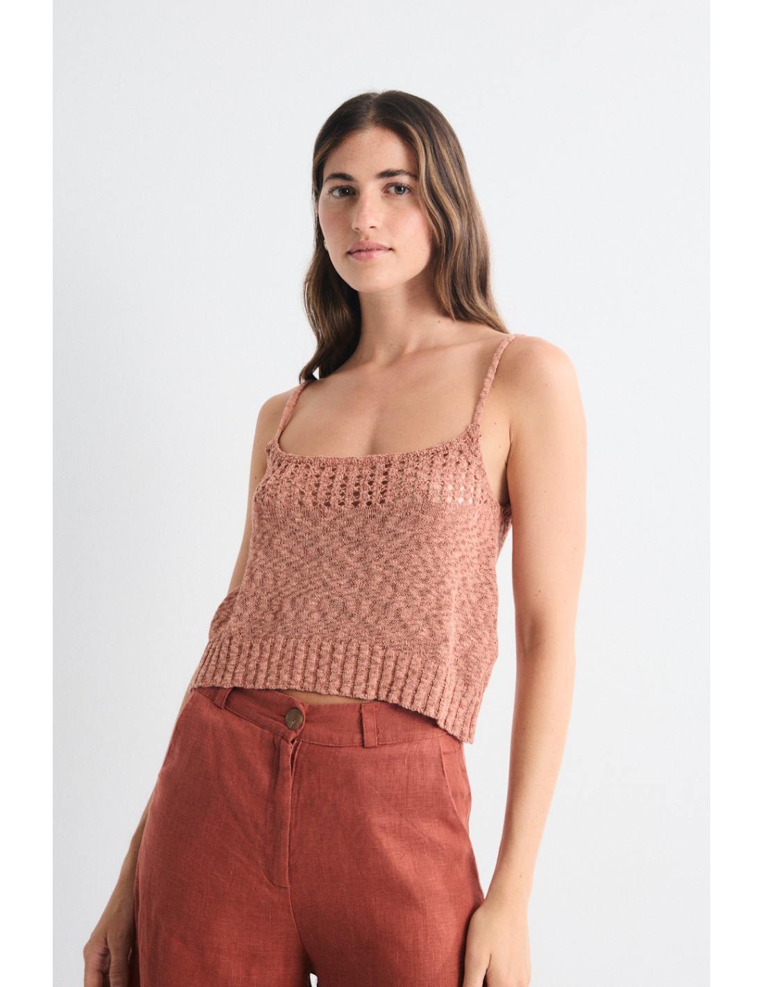 Top en tricot avec fines bretelles, encolure en tricot fantaisie et corps en côtes lisses. Découvrez la famille Balam, qui est complétée par le T-shirt et le jersey dans le même fil.
