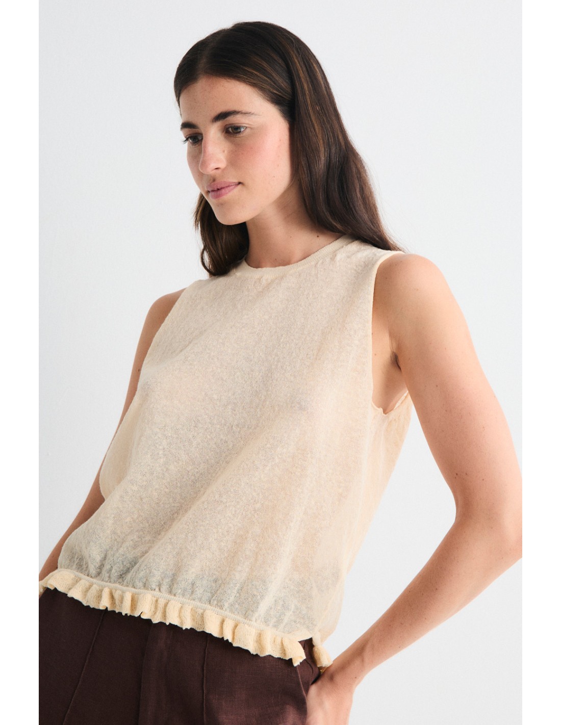 Top en tricot avec mini-volant à l'ourlet et col ras du cou côtelé. Associez-le au cardigan Mirri pour un total look moderne et romantique.