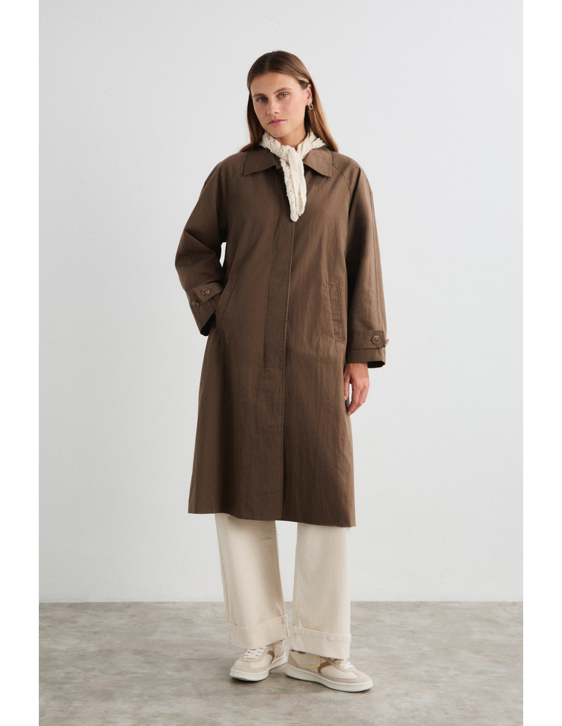 Un trench midi à la coupe fluide et aux manches raglan, avec un empiècement au dos. Il est doté de poches diagonales et d'une fermeture à bouton caché sur le devant. Un vêtement iconique réinterprété et conçu pour les journées printanières.