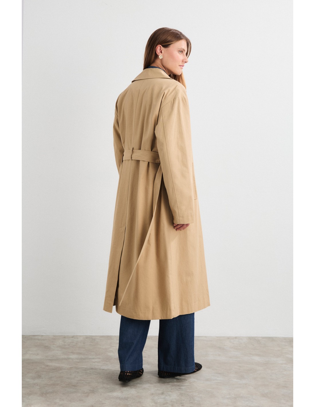 Long trench à col chemise, fermeture centrale à boutons et poches plaquées diagonales sur le devant. Ceinture en tissu uni et ouverture centrale au dos. Doublure à carreaux. Parfait pour les premiers jours du printemps.
