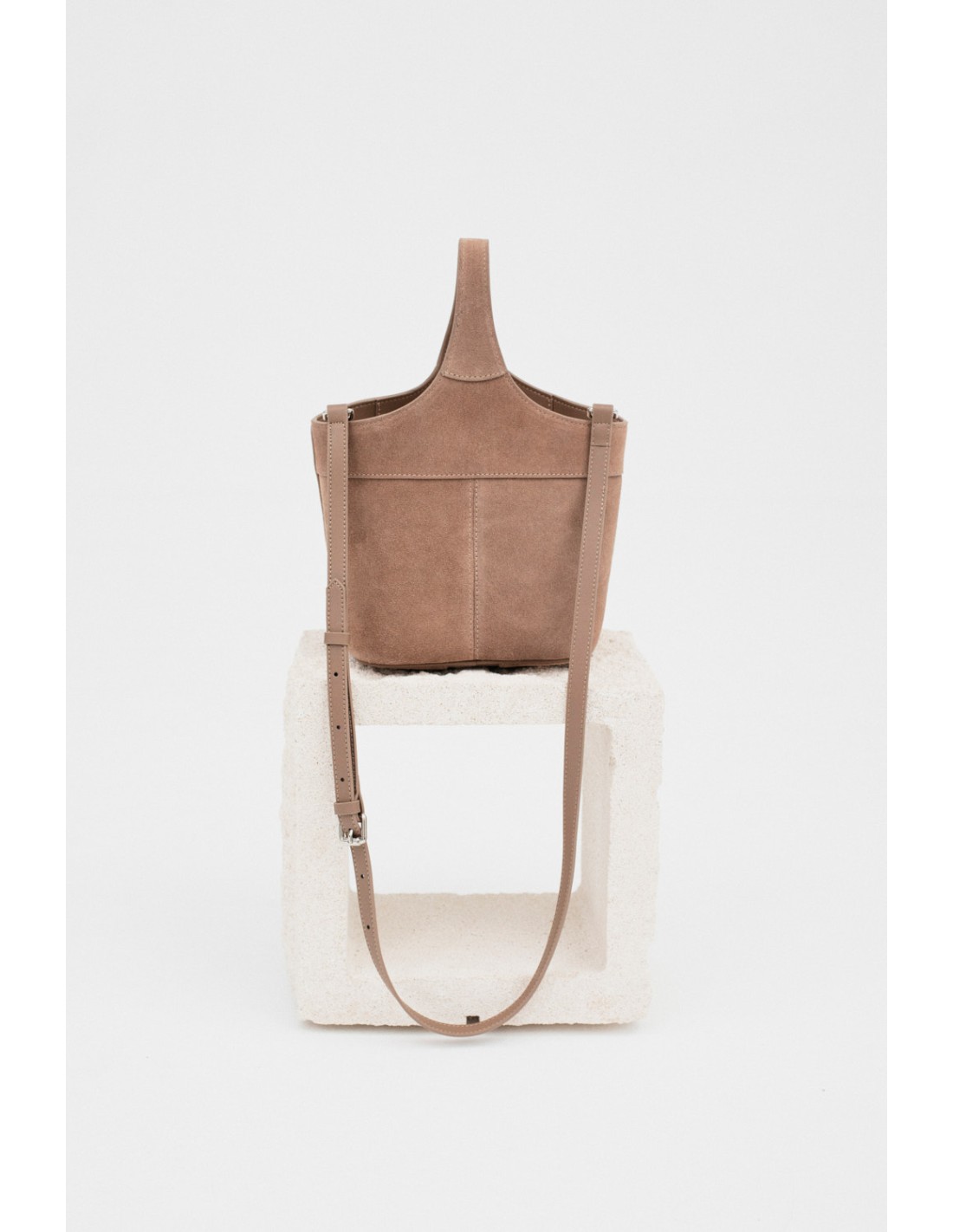 Split leather bag with a short handle and an adjustable long handle. Inside, it has a pocket with leather trim and an inner cotton bag with drawstring. Mus&Bombon logo engraved on the inside.