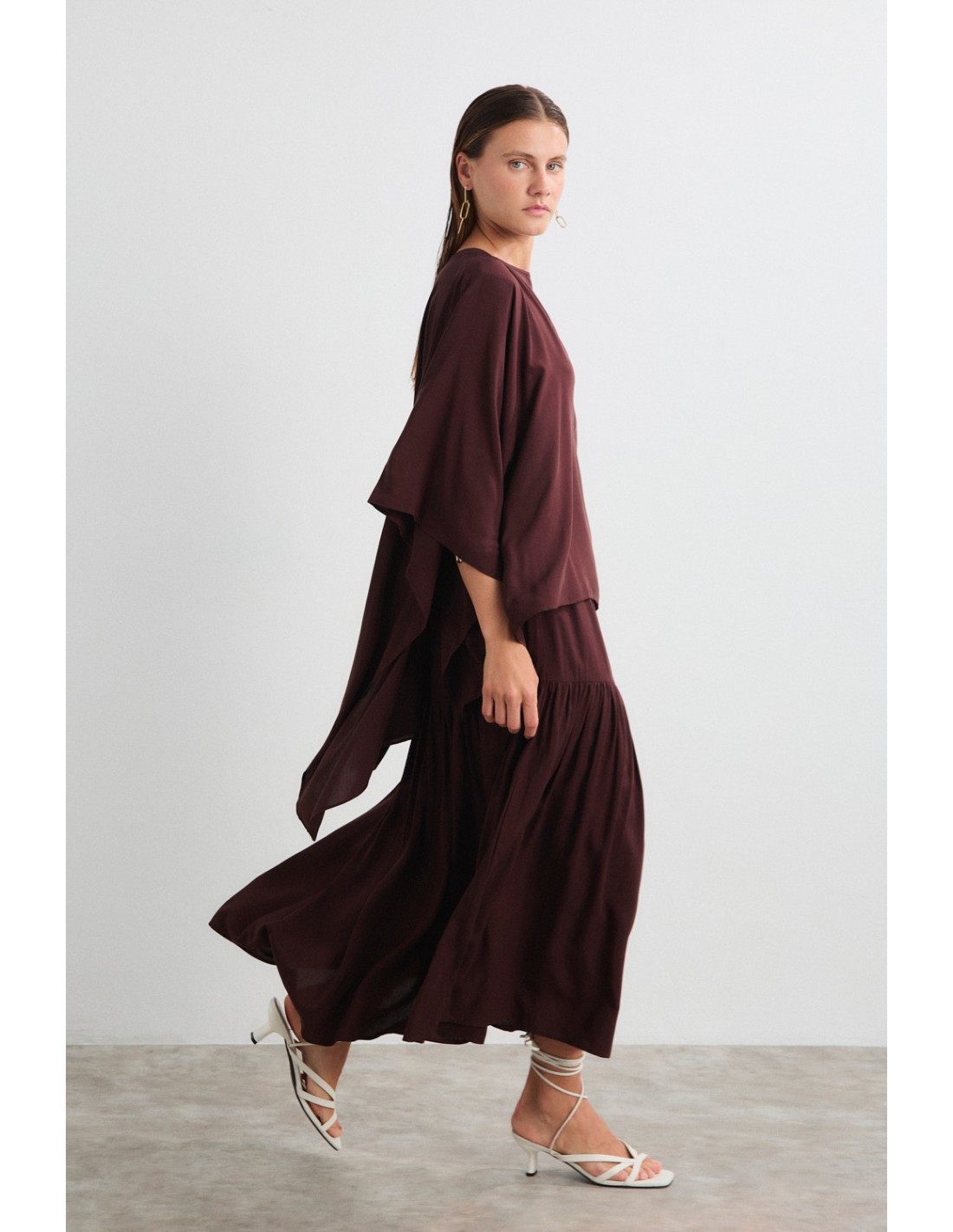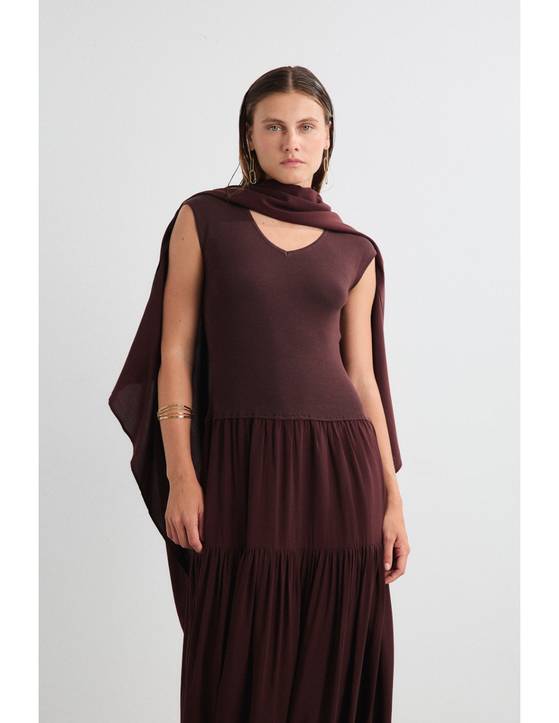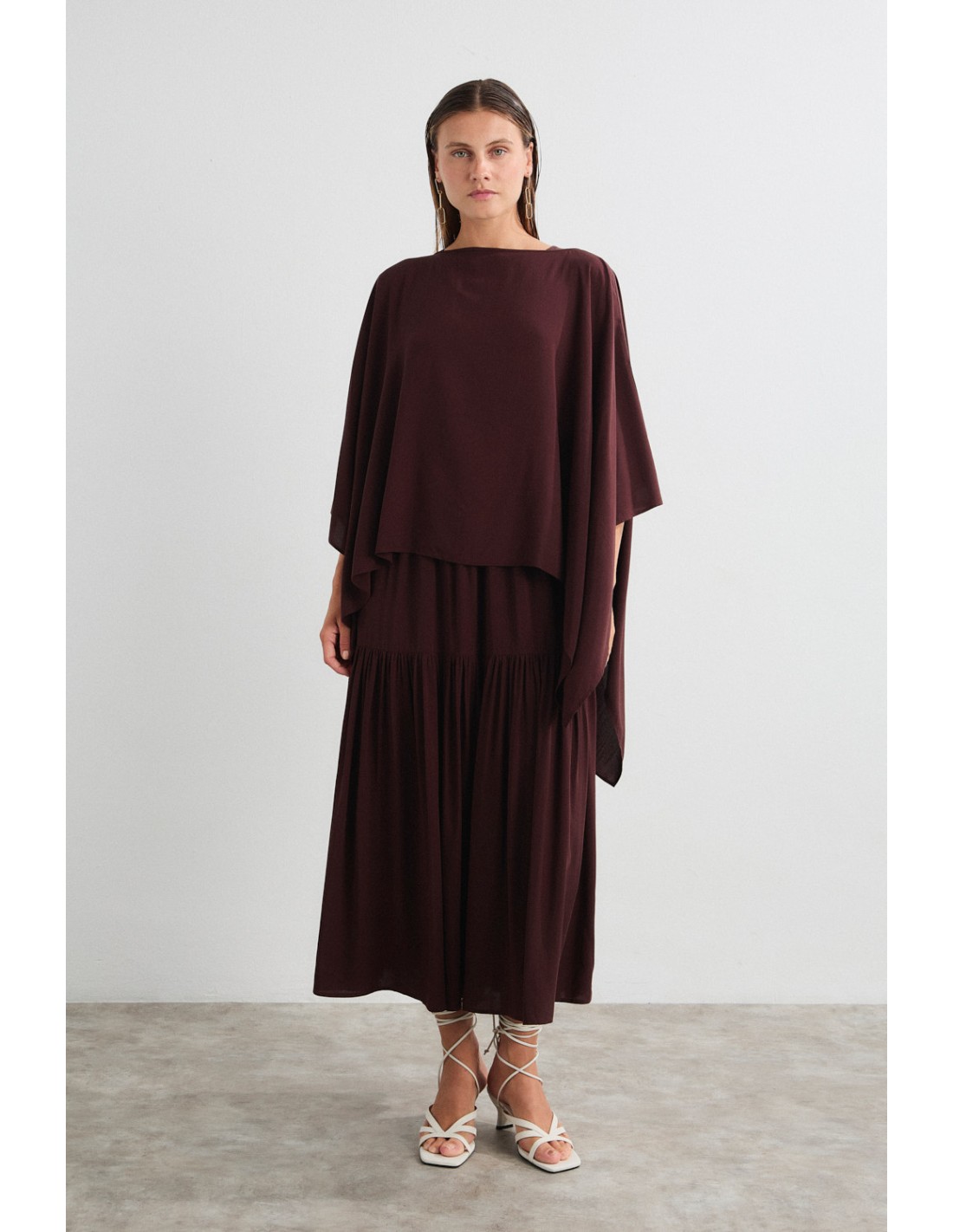 Semi-transparent cape with boat neckline and back longer than the front. Combine it with the Roshan dress for an elegant and sophisticated total look.