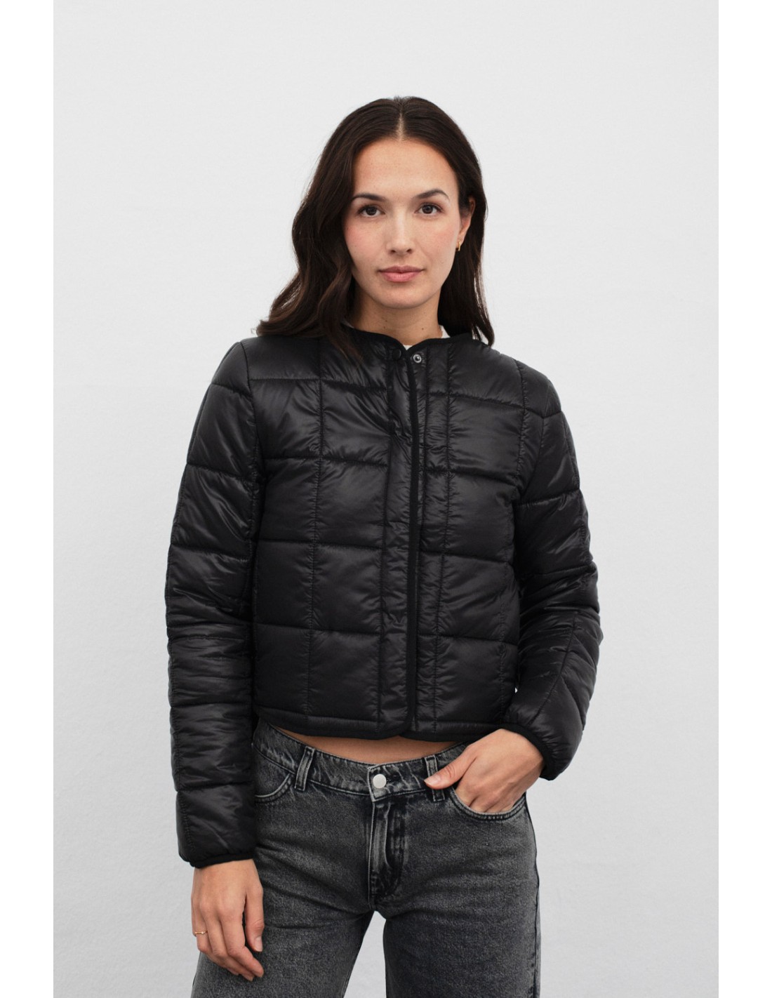 Quilted jacket with plaid design, discreet pockets on the sides and snap button fastening. Modern and functional, perfect to keep you warm on any occasion. Combine with the Corts bag.