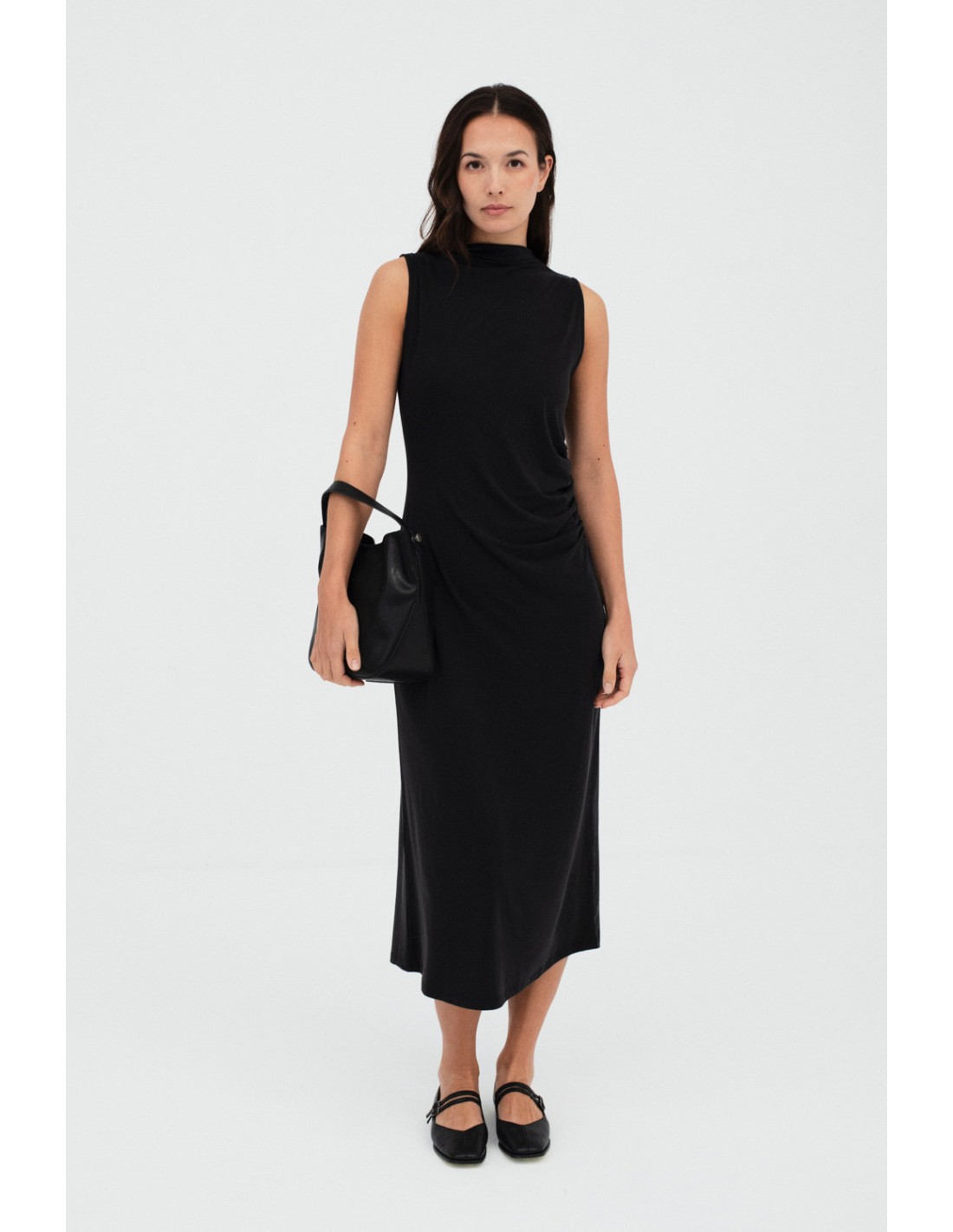Modal dress with cupro effect. It stands out for its diagonal neckline and ruched details on the shoulder and waist. Perfect for an elegant and comfortable look with a modern touch.