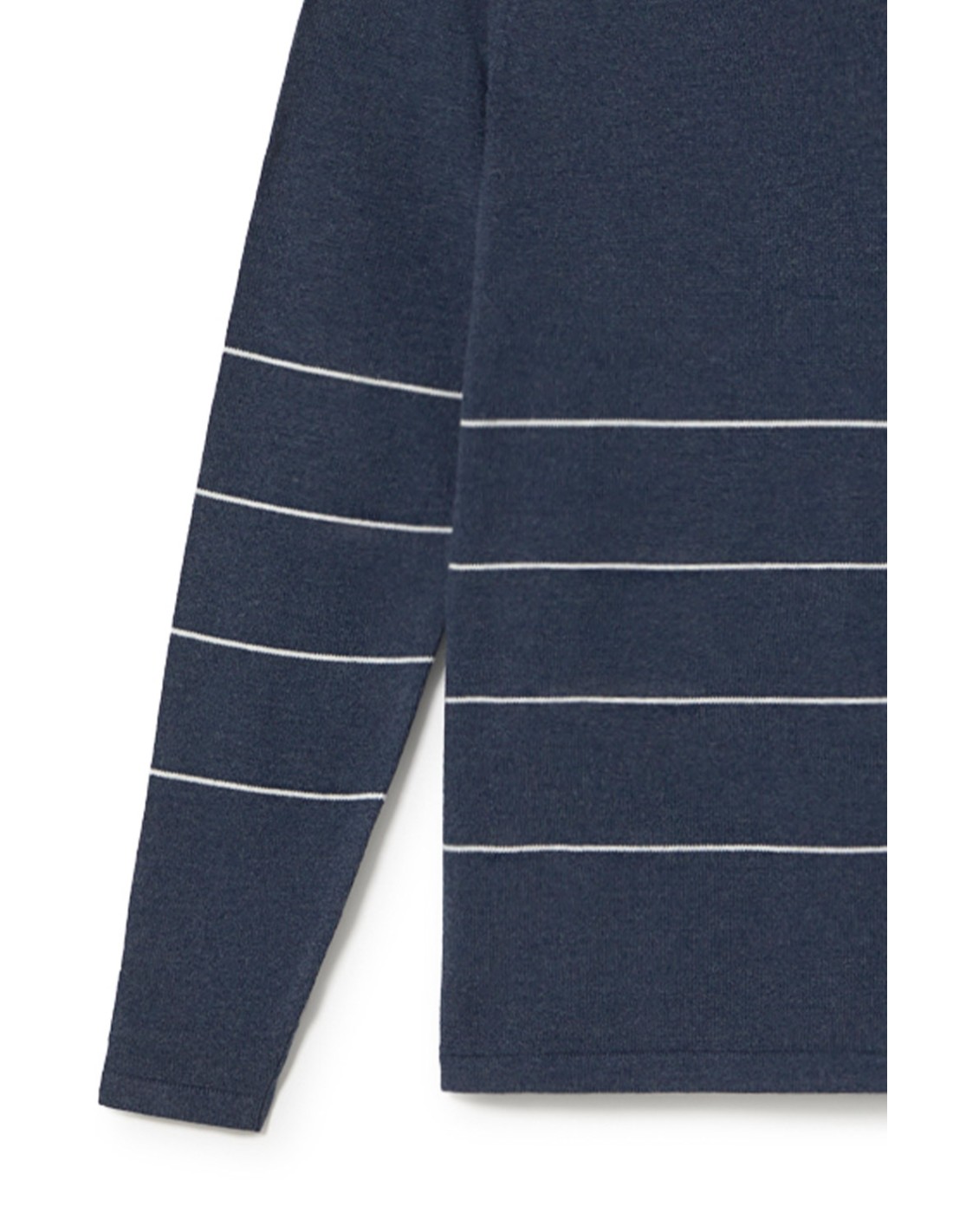 Fine knit jumper with a V-neck and contrasting stripes that add a delicate detail. Its soft fabric and light drape make it perfect for wearing on its own or paired with the Esterope skirt.