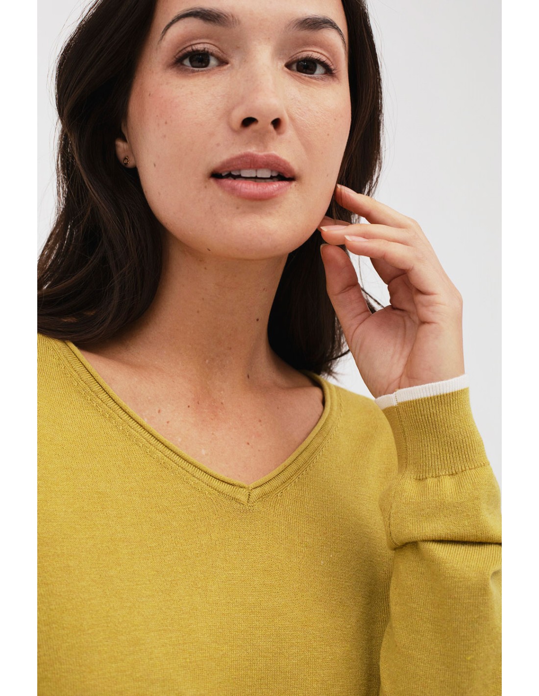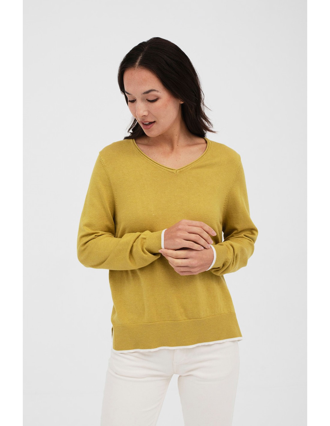 Basic knitted jumper with long sleeves and a V-neck. The cuffs and hem are trimmed with an elegant contrasting colour, giving it a modern and sophisticated style. Coordinates perfectly with the Naka trousers.