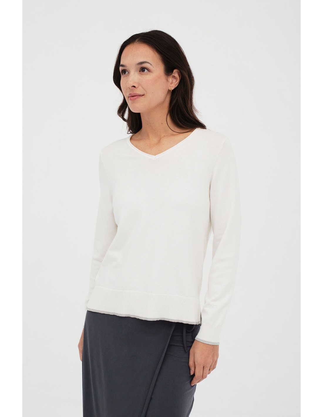 Basic knitted jumper with long sleeves and a V-neck. The cuffs and hem are trimmed with an elegant contrasting colour, giving it a modern and sophisticated style. Coordinates perfectly with the Naka trousers.