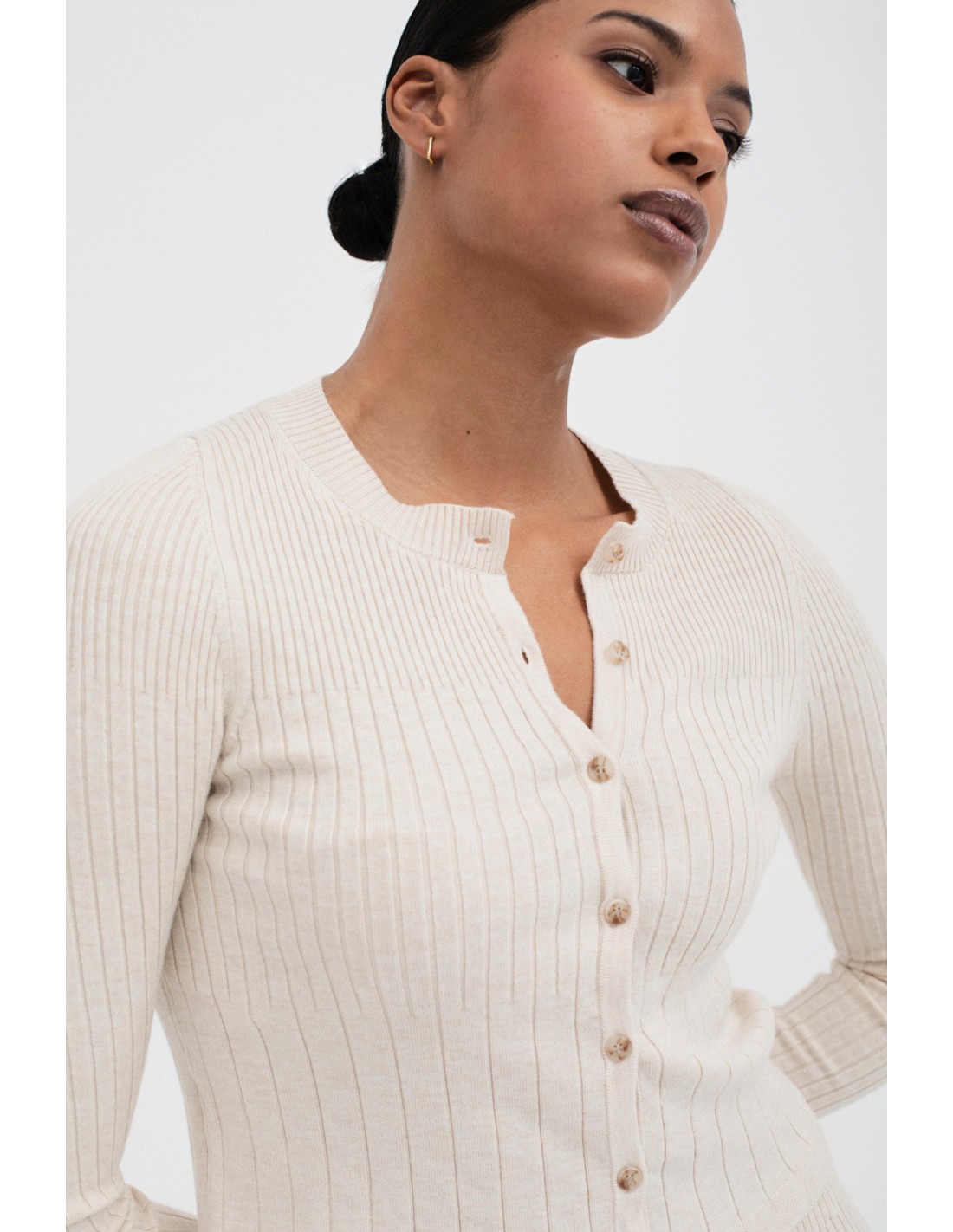 Long-sleeved, straight-cut cardigan with an unique design combining three different types of ribbing on the body and two on the sleeves. It has a round neck and a front button placket. The cuffs feature a three-button detail. It pairs perfectly with the Seef top for a two-piece design.