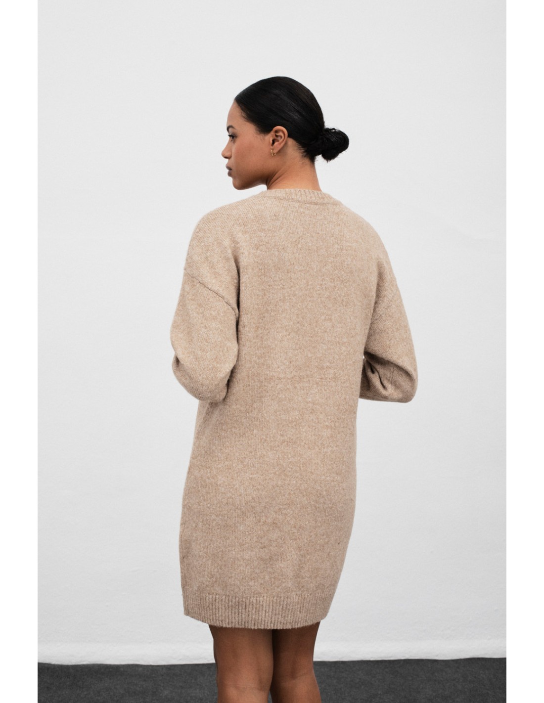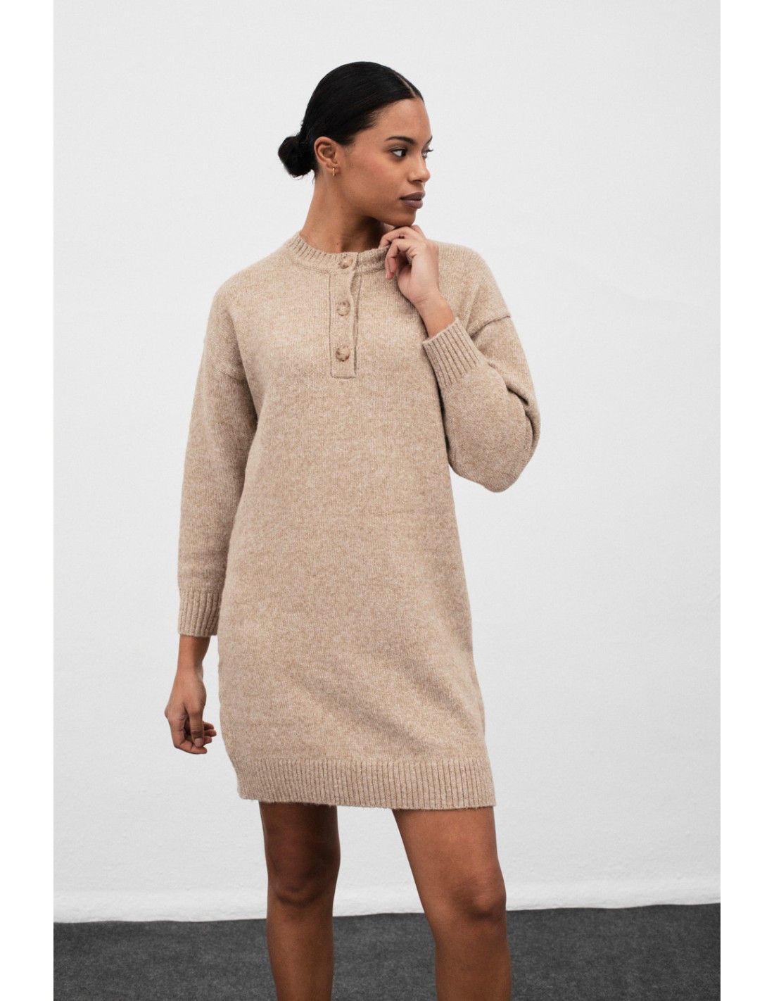 Short knitted dress with a ribbed trim and front button placket detail for a sophisticated and versatile style.