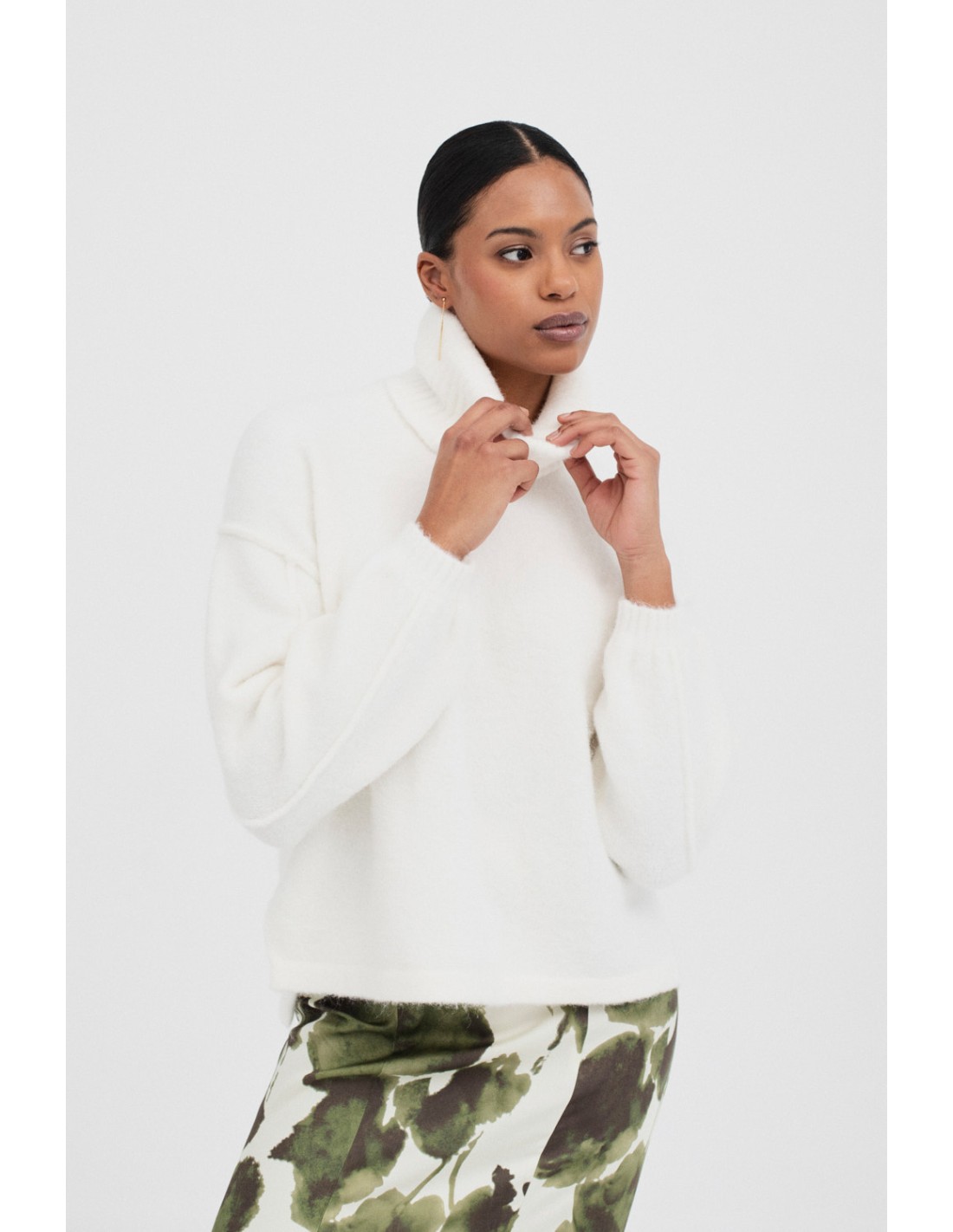 Long sleeved jumper that comes with a high neck complement. It is detailed with external stitching and ribbed trims, which gives it a modern and elegant style.
