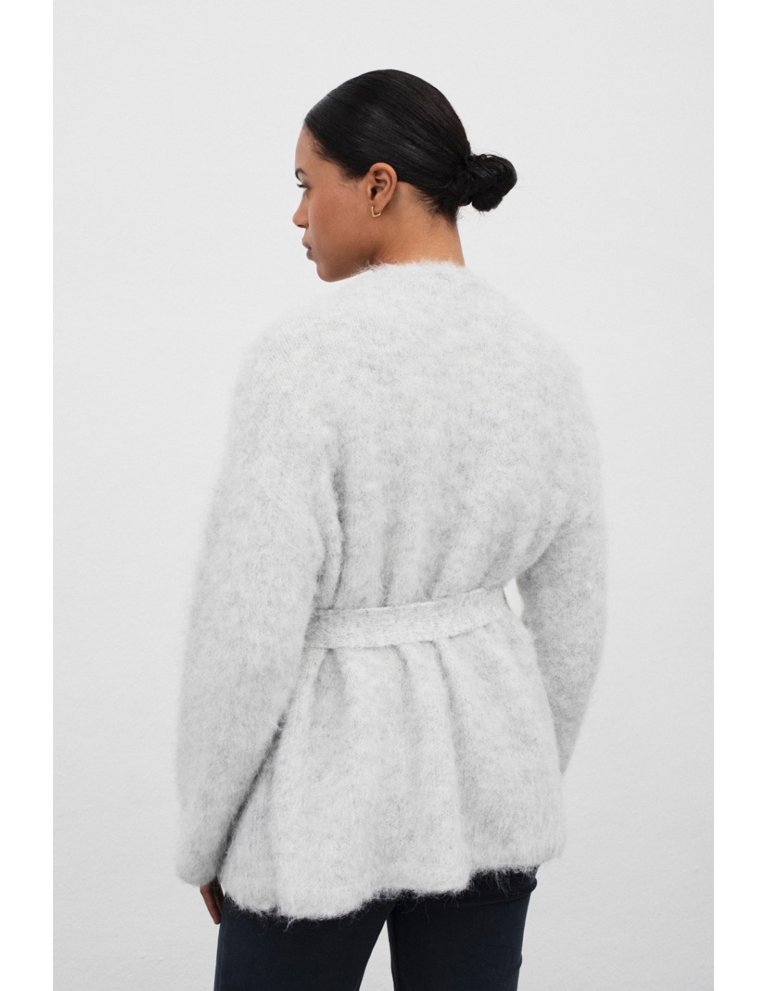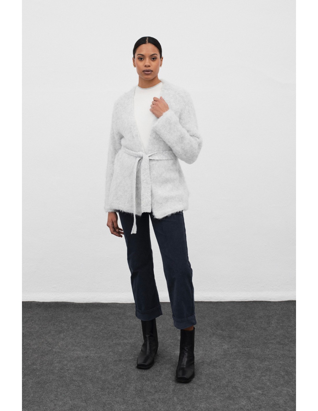Long cardigan with V-neckline and slits in the side seams. Smooth kinitted body in plush and flat belt. It offers a sophisticated and unique design.