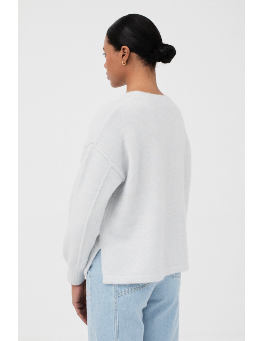 V-neck jumper with a false opening with buttons and ribbed cuffs, giving it a unique and versatile twist.