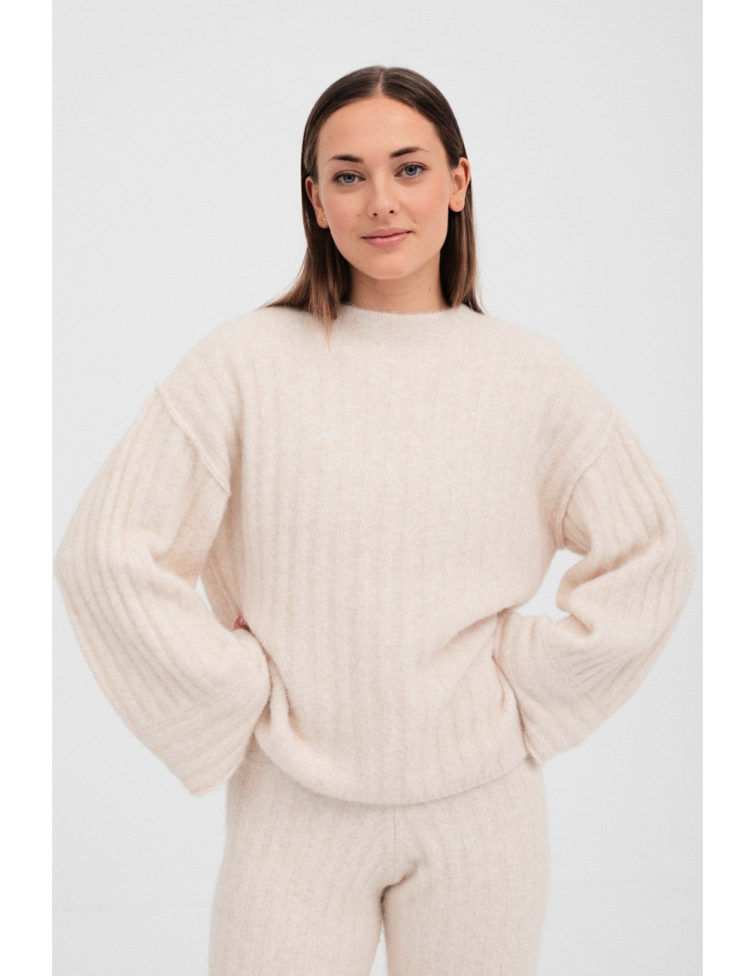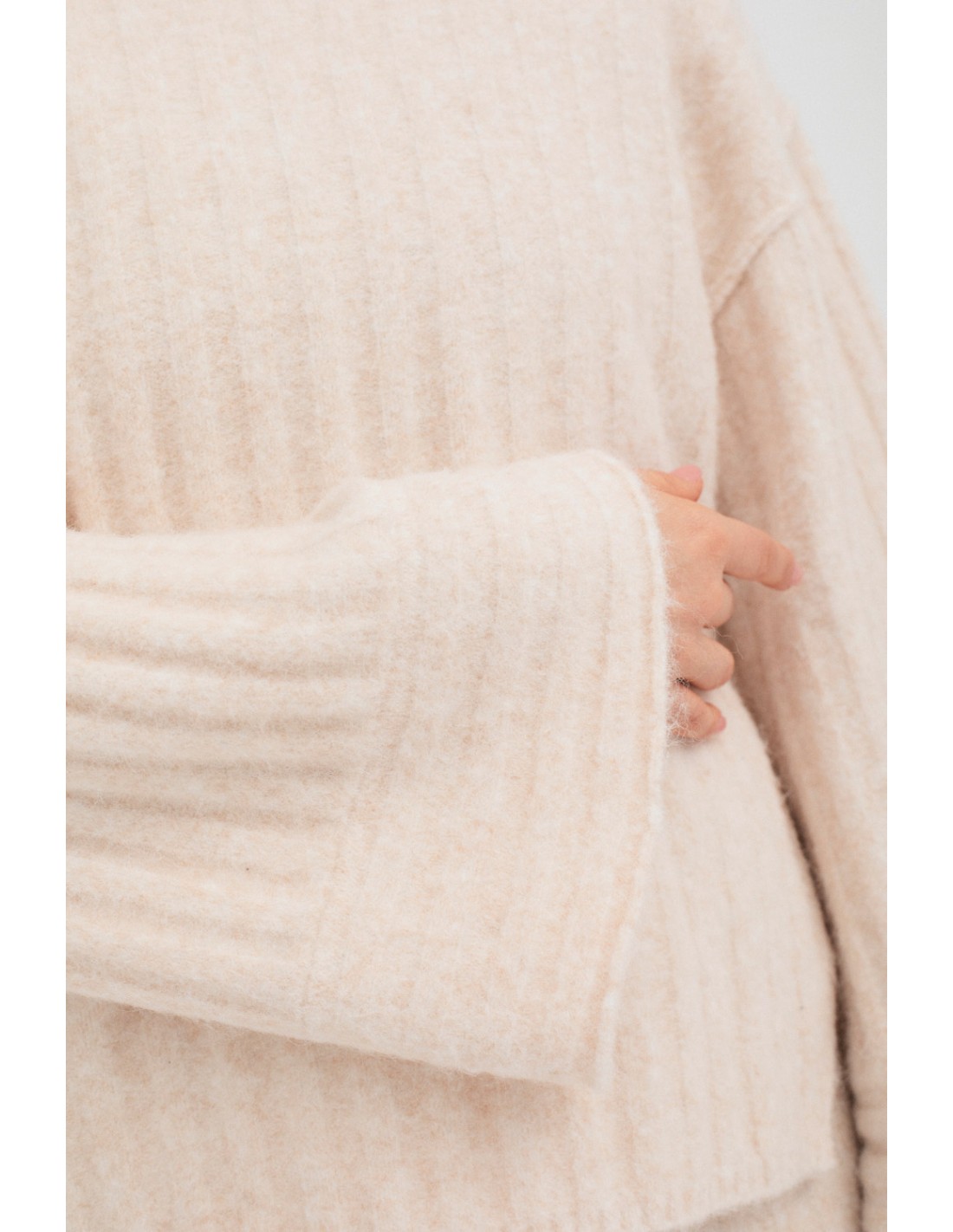 Long-sleeved jumper with an elegant ribbed turtleneck. The body and sleeves are detailed with horizontal ribbing at the cuffs. The hem also has a ribbed finish, with a diagonal slit on the left side. It goes perfectly with the Nowon trousers.