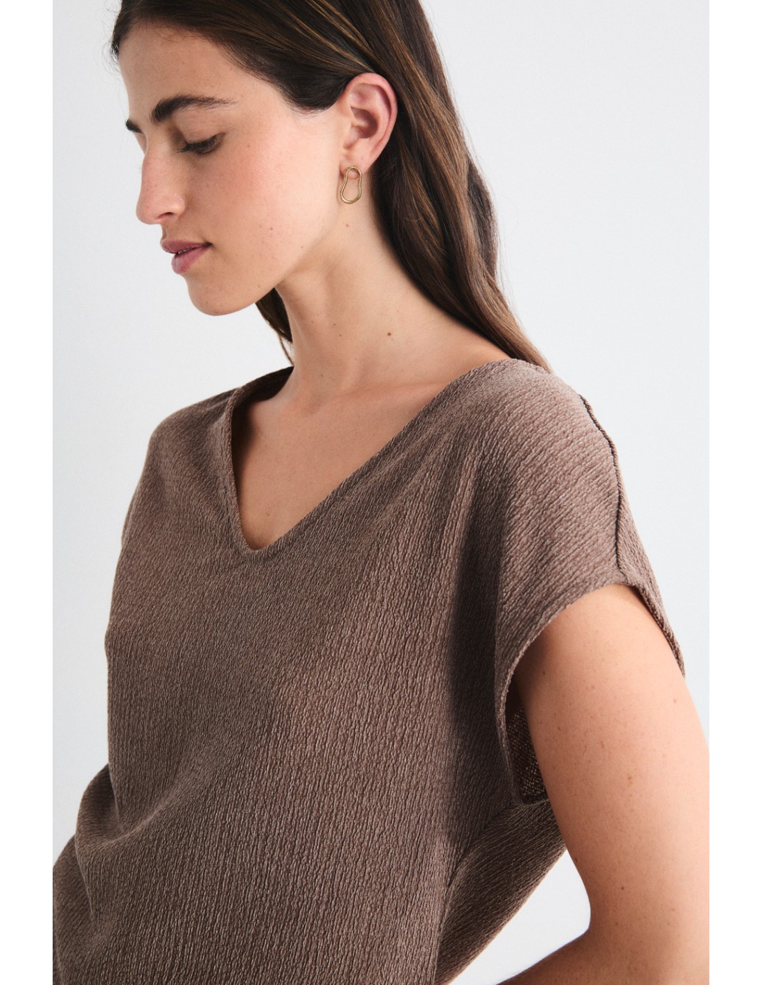 A T-shirt made with a textured fabric. It features a V-neckline and small side slits for lightness and movement. Combine it with the Liora trousers for an elegant total look. Also available in the Liora dress in the same fabric.