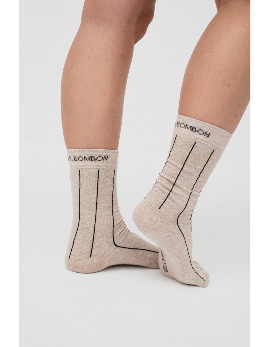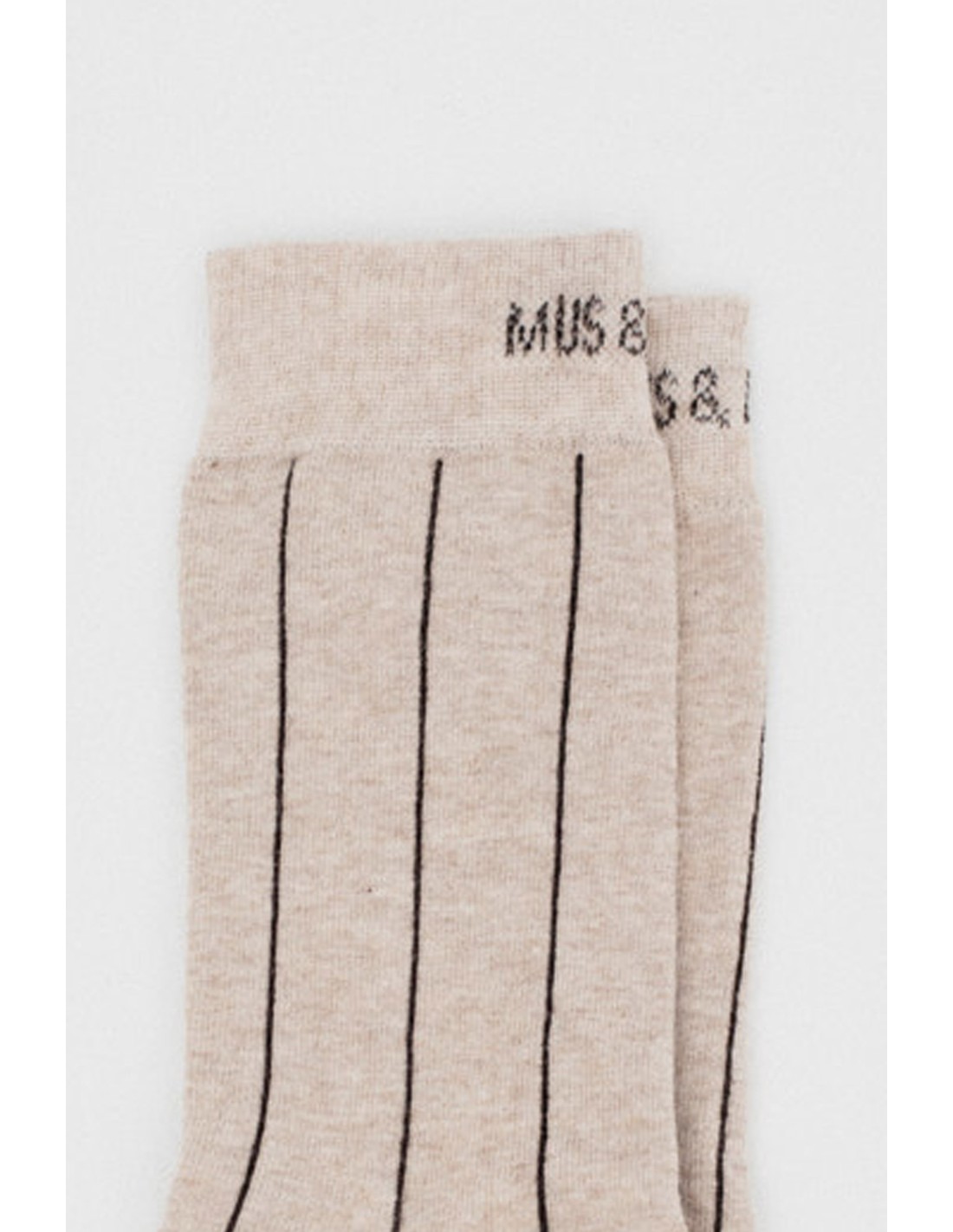 Mid-calf socks with ribbed detail on top. Toe, sole, heel and elastic to match the base. With Mus&Bombon logo on the bottom and elastic at the back. Designed with prints from the collection.