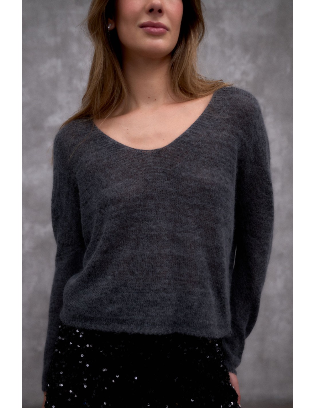 Metallic knit jumper with ribbed round neck and long sleeves. Features ribbed detailing with cut-outs on the back. Pair it with the Trine cape for an elegant look this festive season.