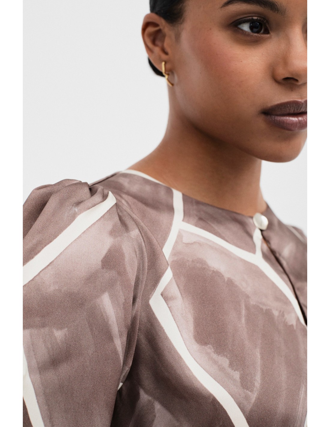 Printed blouse with long puffed sleeves, a yoke detail on the back and a teardrop neckline with a fancy metallic button. Match with the Vasastan skirt for a romantic look.