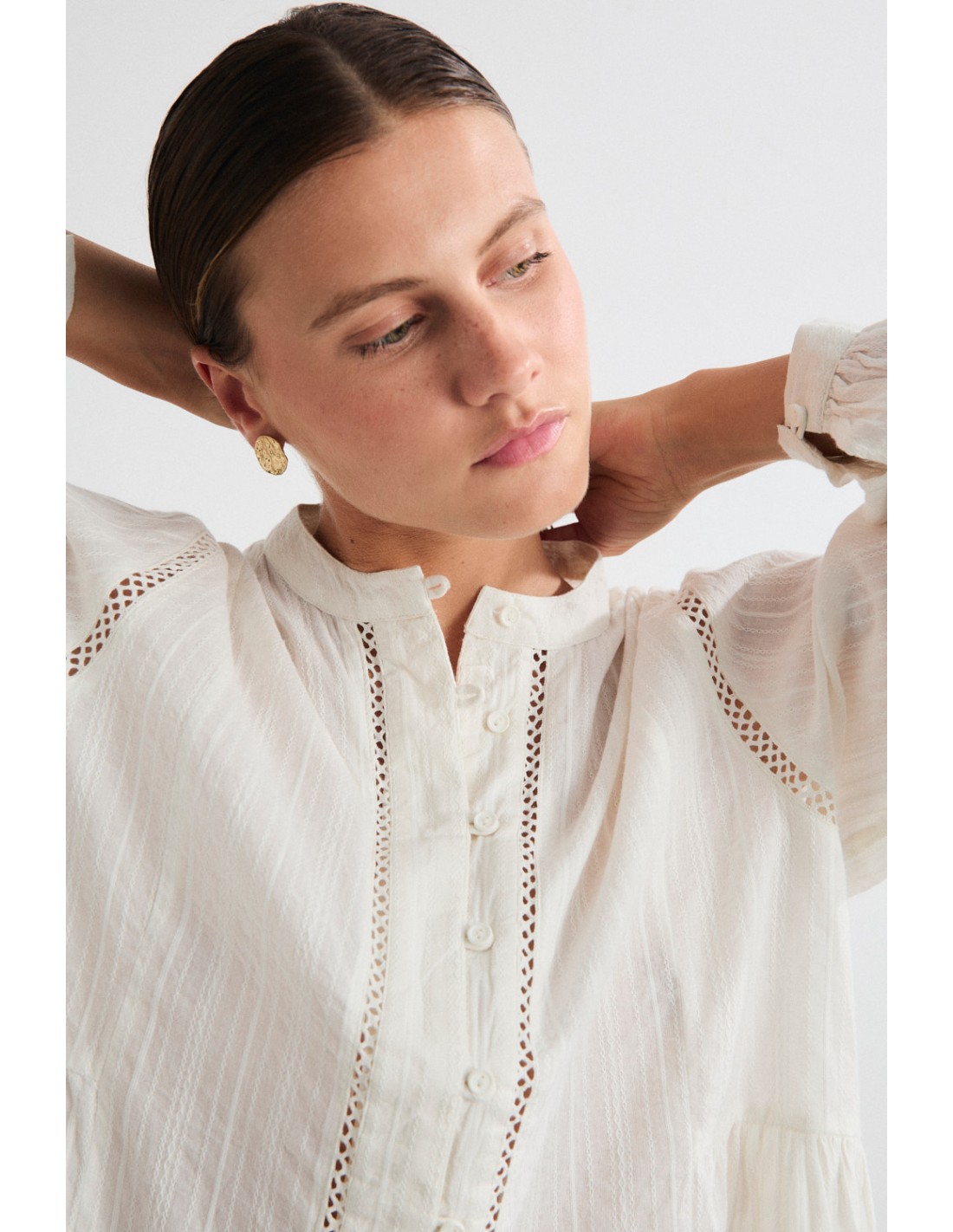 Romantic blouse with mao collar and front button placket. It stands out for its interlining details and a delicate ruffle at the hem that adds movement and subtle elegance.