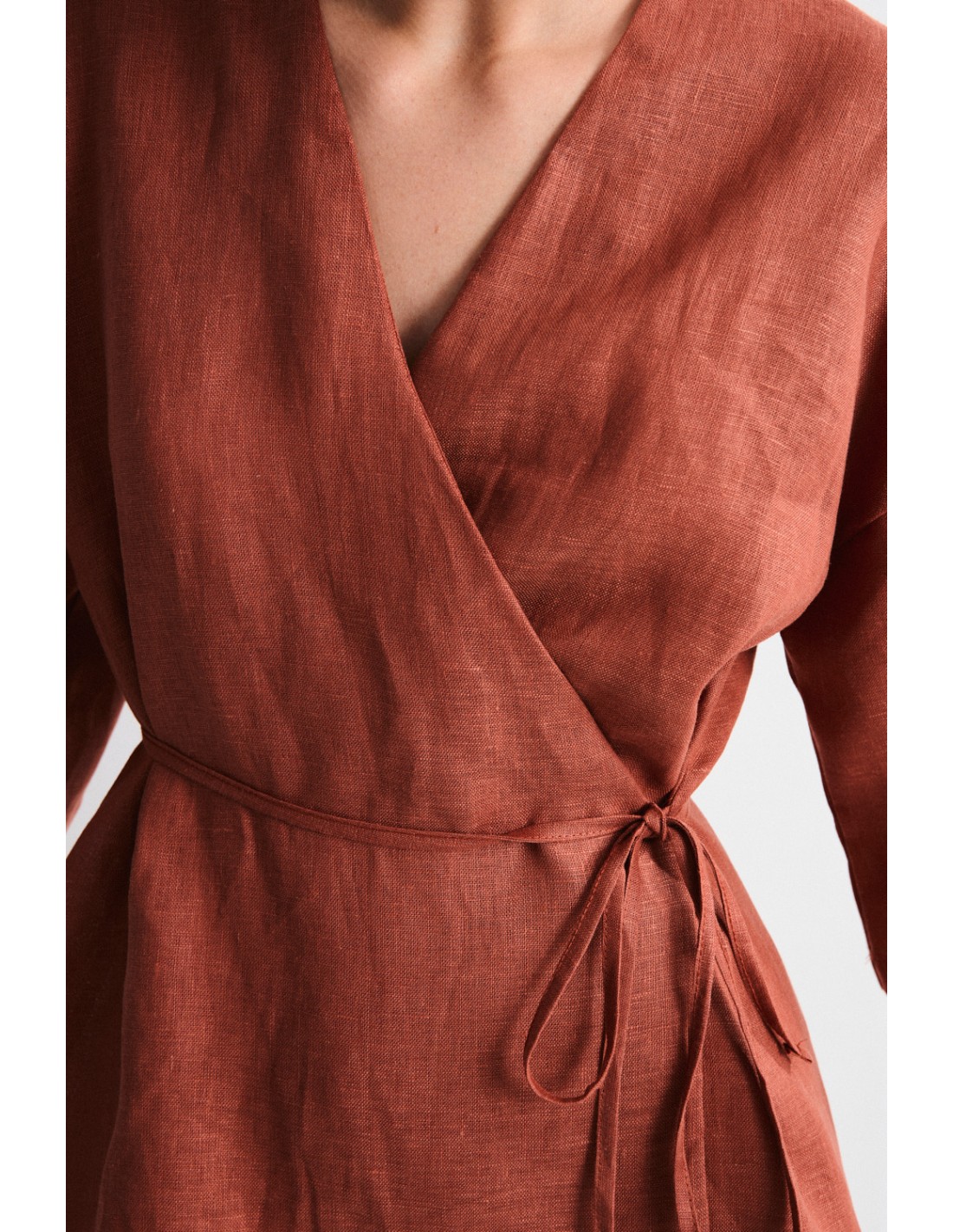 Linen kimono with three-quarter sleeves and lace-up closure. It is part of the Bobby family, along with the pants and shirt of the same fabric, for a serene and sophisticated outfit.