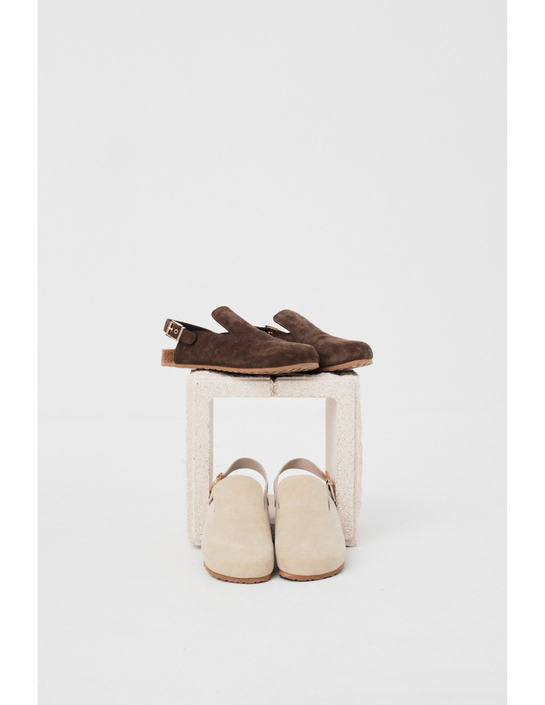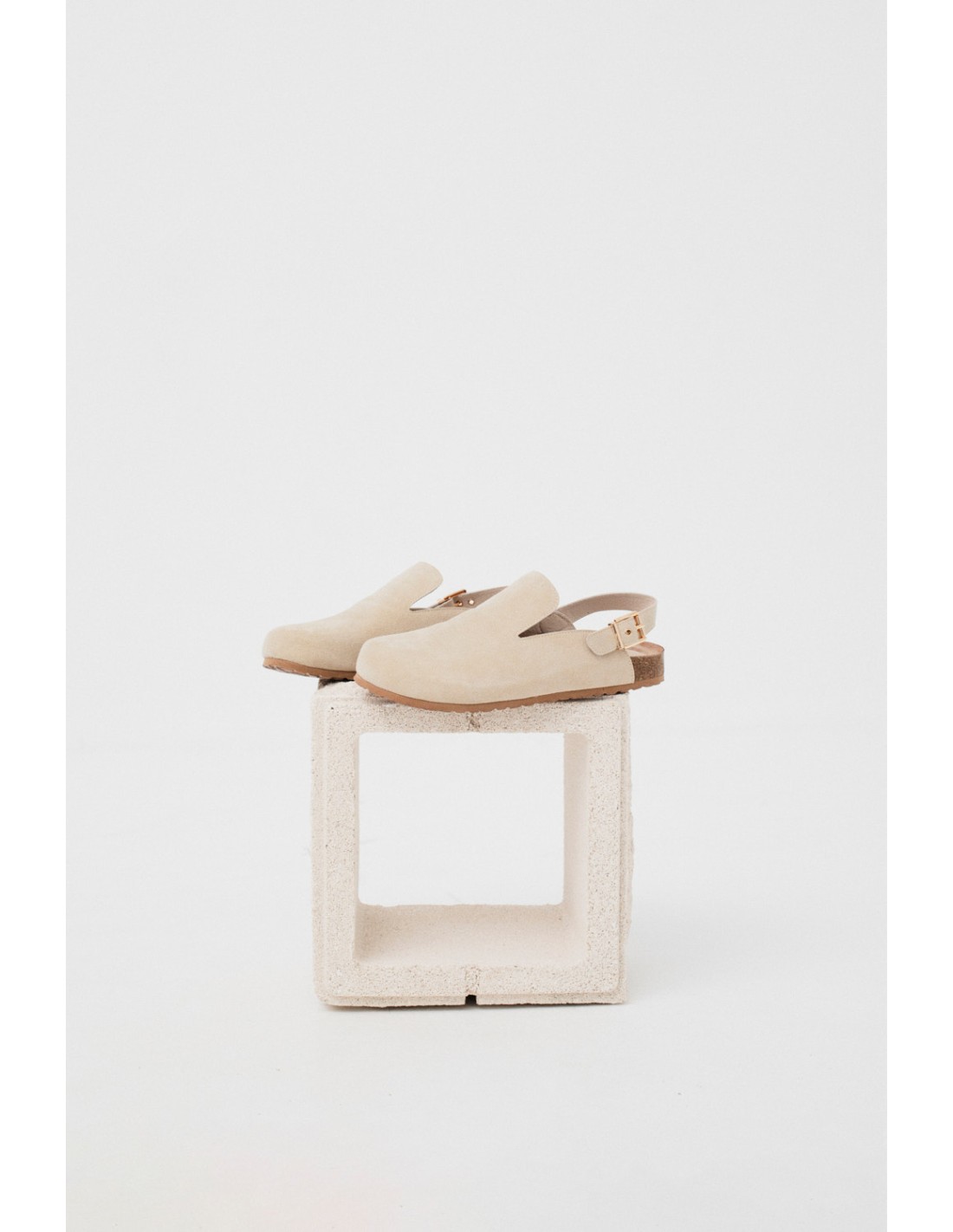 Split leather clogs, open at the back where they close with an adjustable strap and golden buckle. They have a rubber sole and the logo engraved on the heel insole.