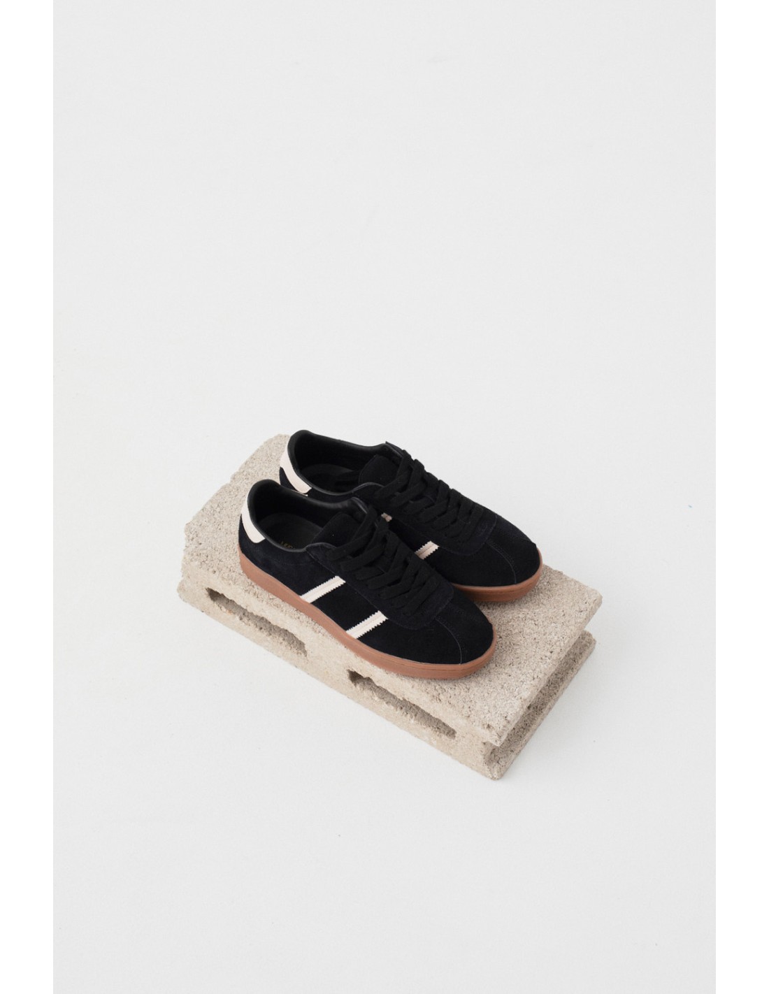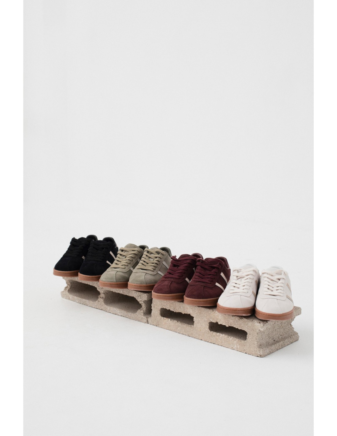 Split leather sneakers with two side stripes in contrasting colour. Rubber sole and tone-on-tone flat laces. It also features the Mus&Bombon logo on the heel and insole.