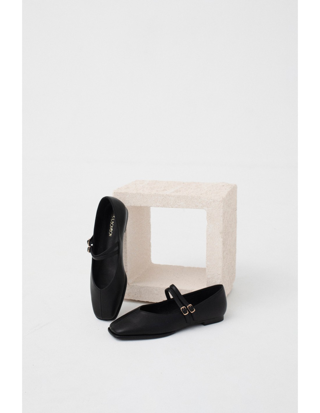 Ballerinas with two straps and golden buckles, square toe and simple stitching details. Rubber sole and low heel. Ideal for all occasions.