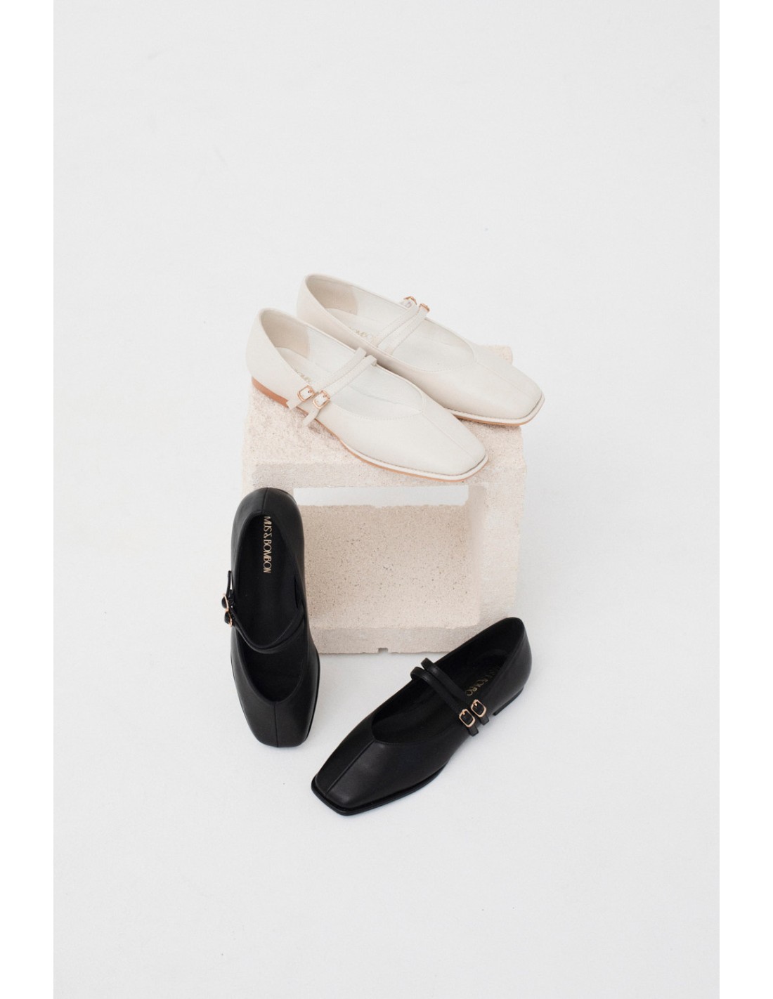 Ballerinas with two straps and golden buckles, square toe and simple stitching details. Rubber sole and low heel. Ideal for all occasions.