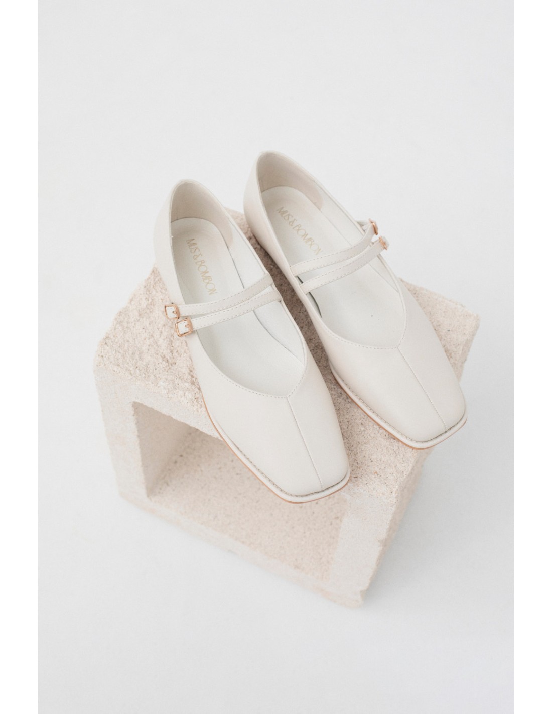 Ballerinas with two straps and golden buckles, square toe and simple stitching details. Rubber sole and low heel. Ideal for all occasions.