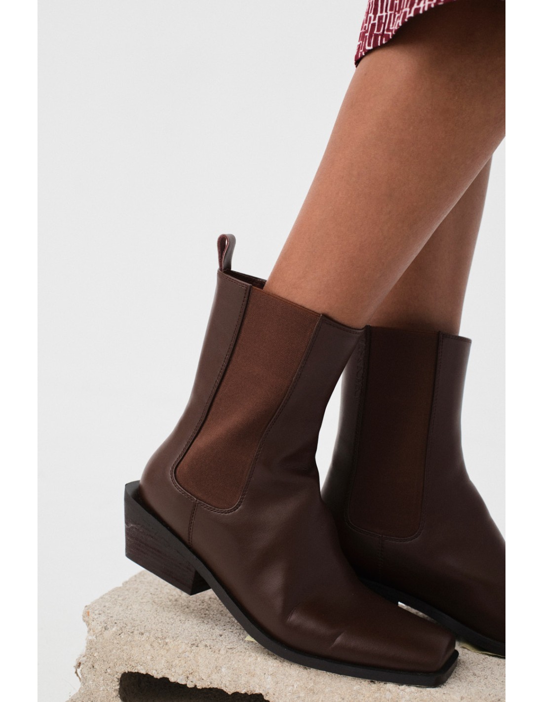 Defined by their square shape, the Taku are leather boots with a square toe and matching heel. They feature rectangular elasticated bands on the sides for a comfortable fit and easy slip-on.