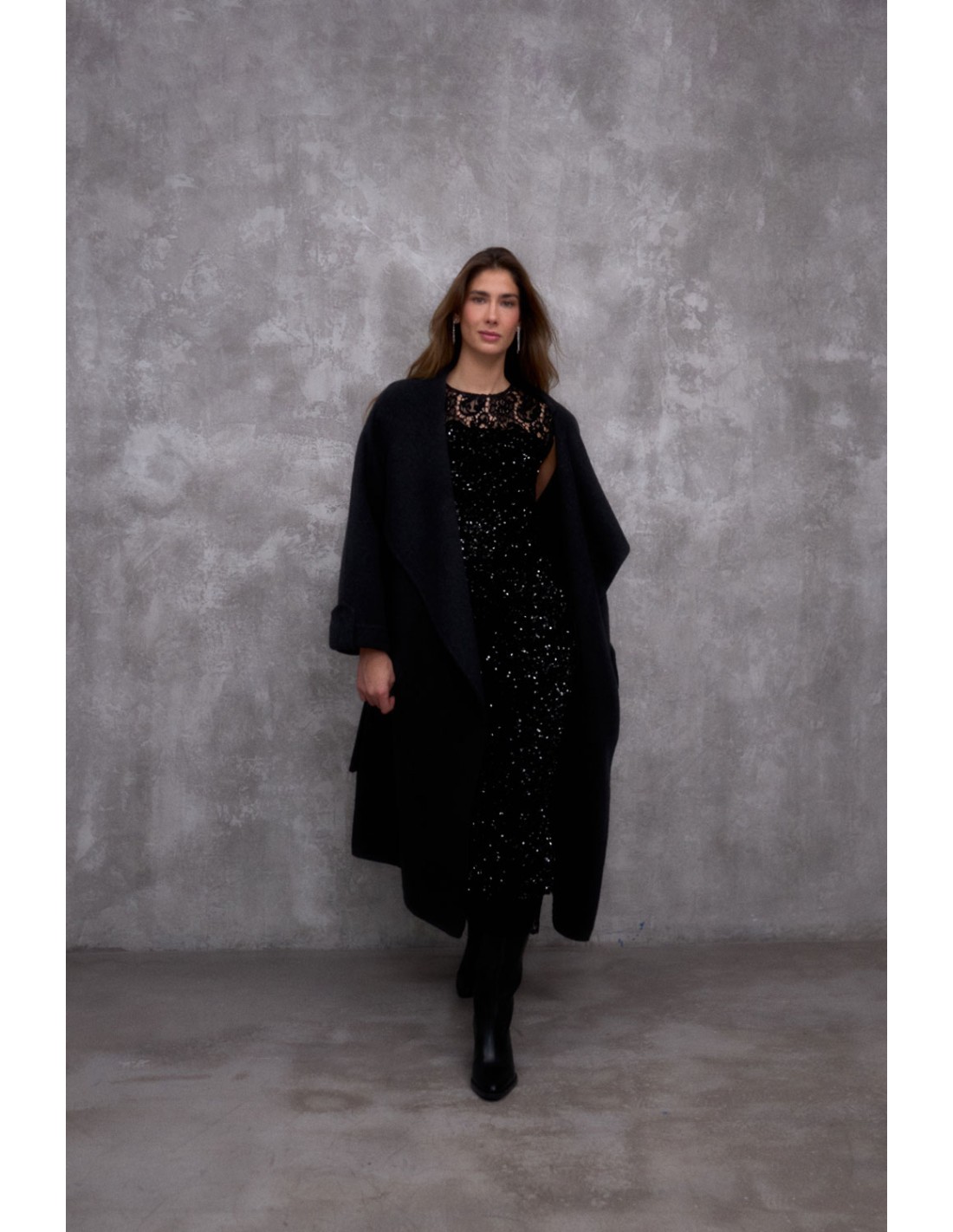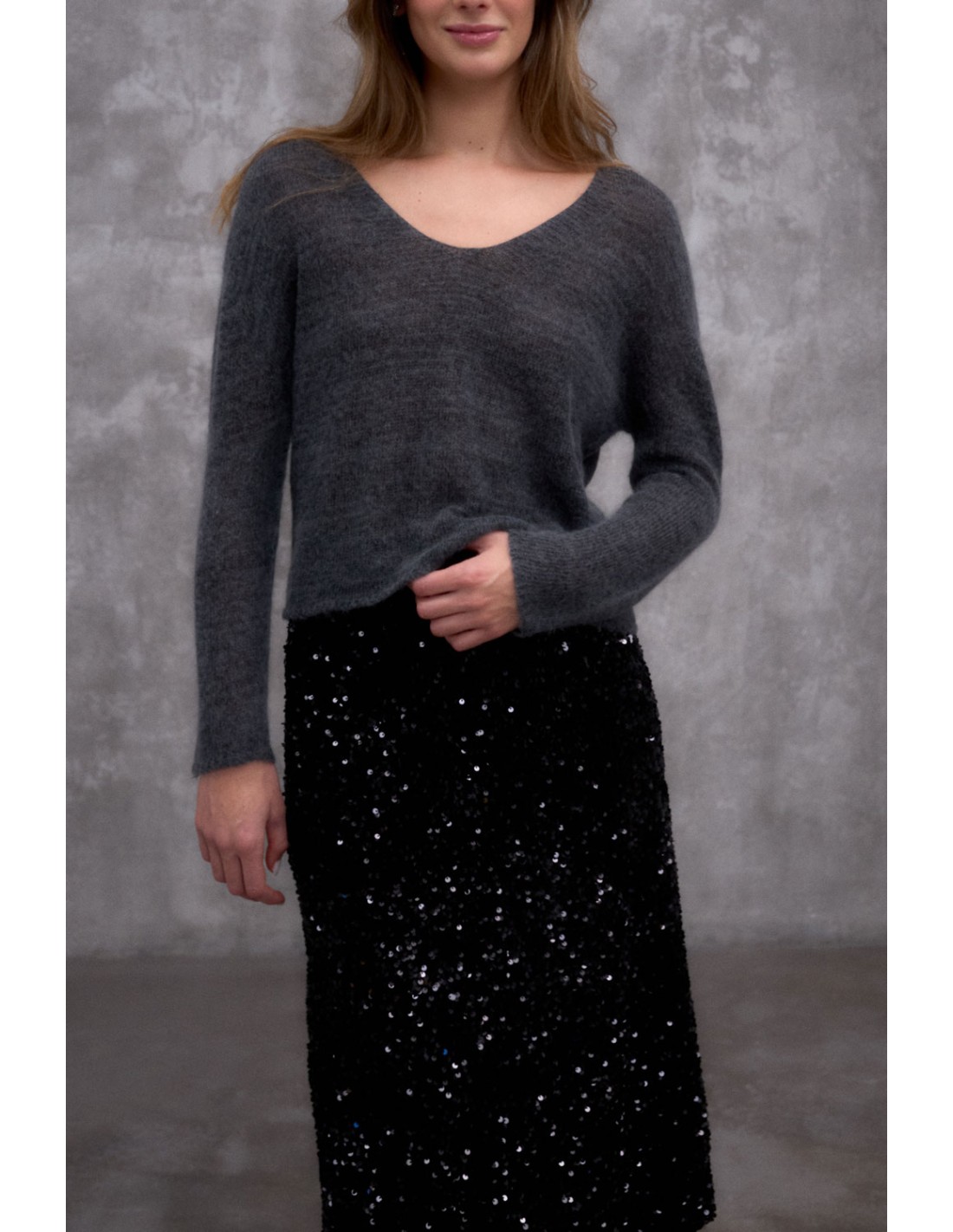 Long skirt made from sequinned fabric. The waistband, with elastic inside, ensures a comfortable and flattering fit. It features an integrated lining finished with a delicate lace trim at the hem, adding a touch of sophistication. Pair it with the Daub or the Udai top to create a festive total look.