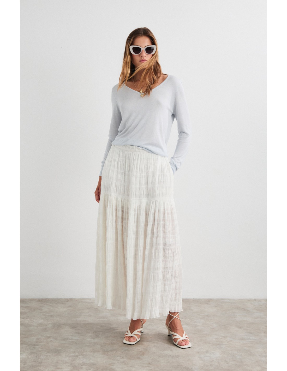 Double ruffle skirt with elasticated waist and side pockets. Combine it with the Bruma shirt for a harmonious total look. Also available the Bruma dress in the same fabric.