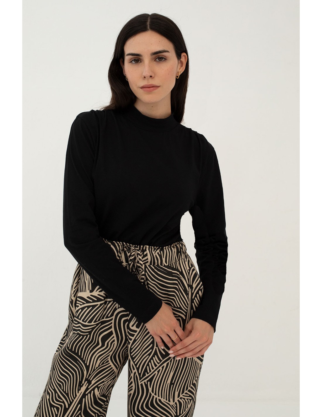 With long sleeves, a high double collar and ruffle detail on the shoulders, our Basieco T-shirt will become your best ally for the winter.