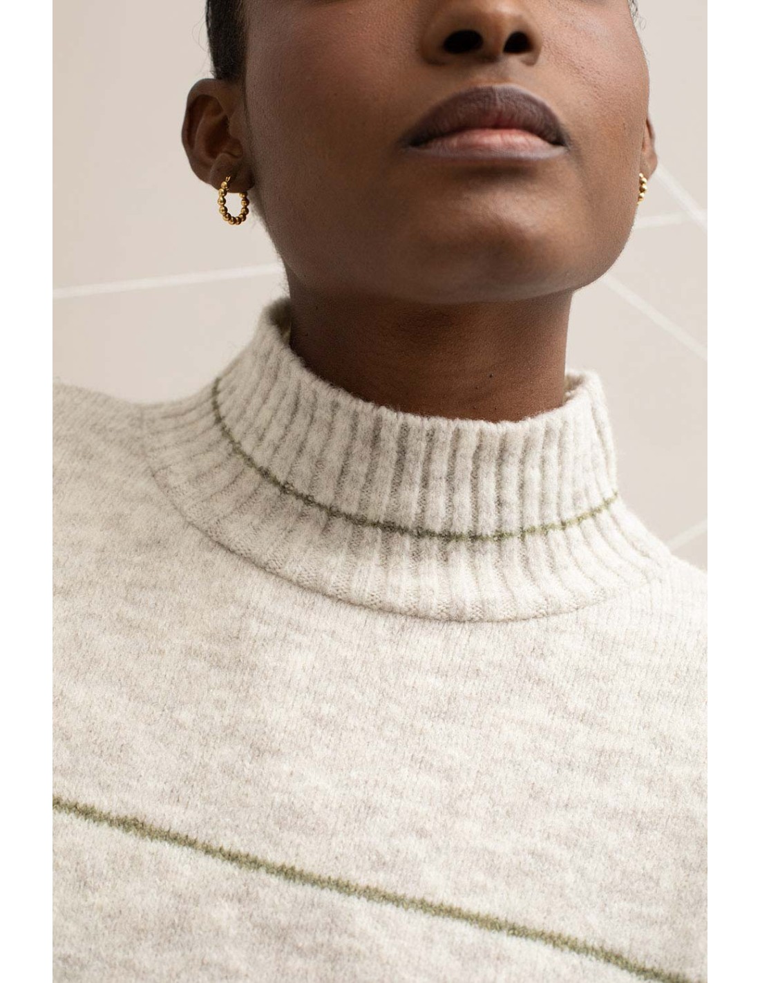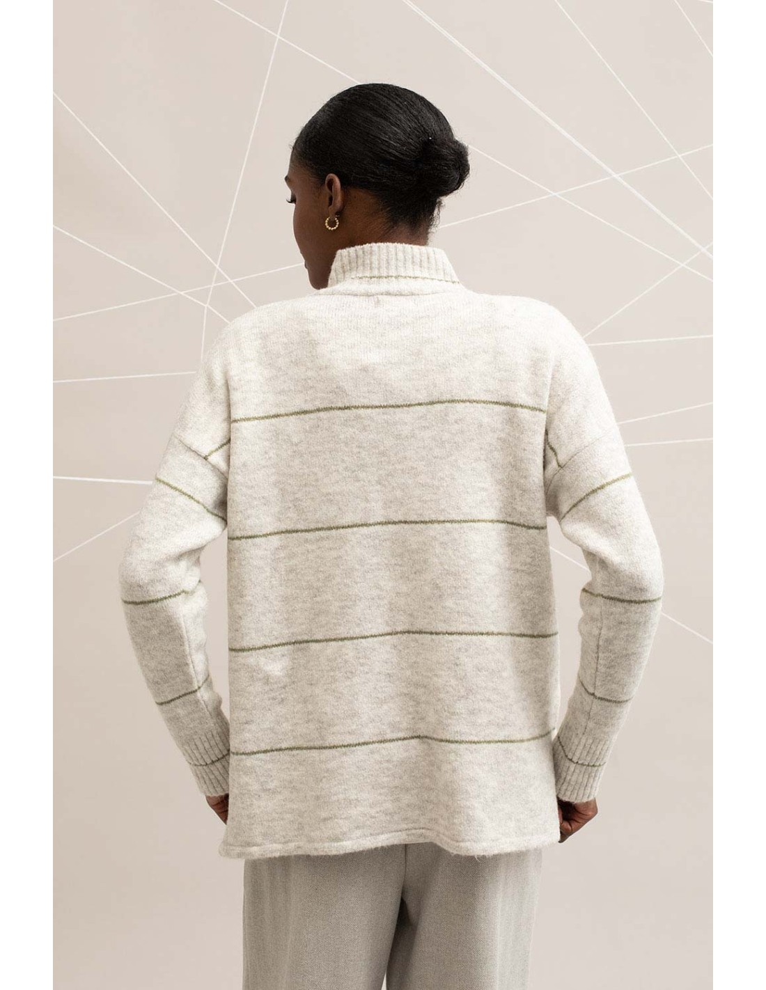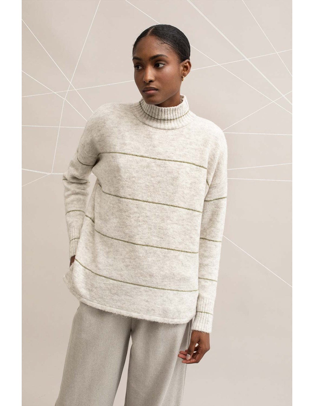 The Eume jumper features a perkins collar design with contrast piping, long sleeves and side slits, offering a combination of contemporary styling and distinctive figure-enhancing detailing.