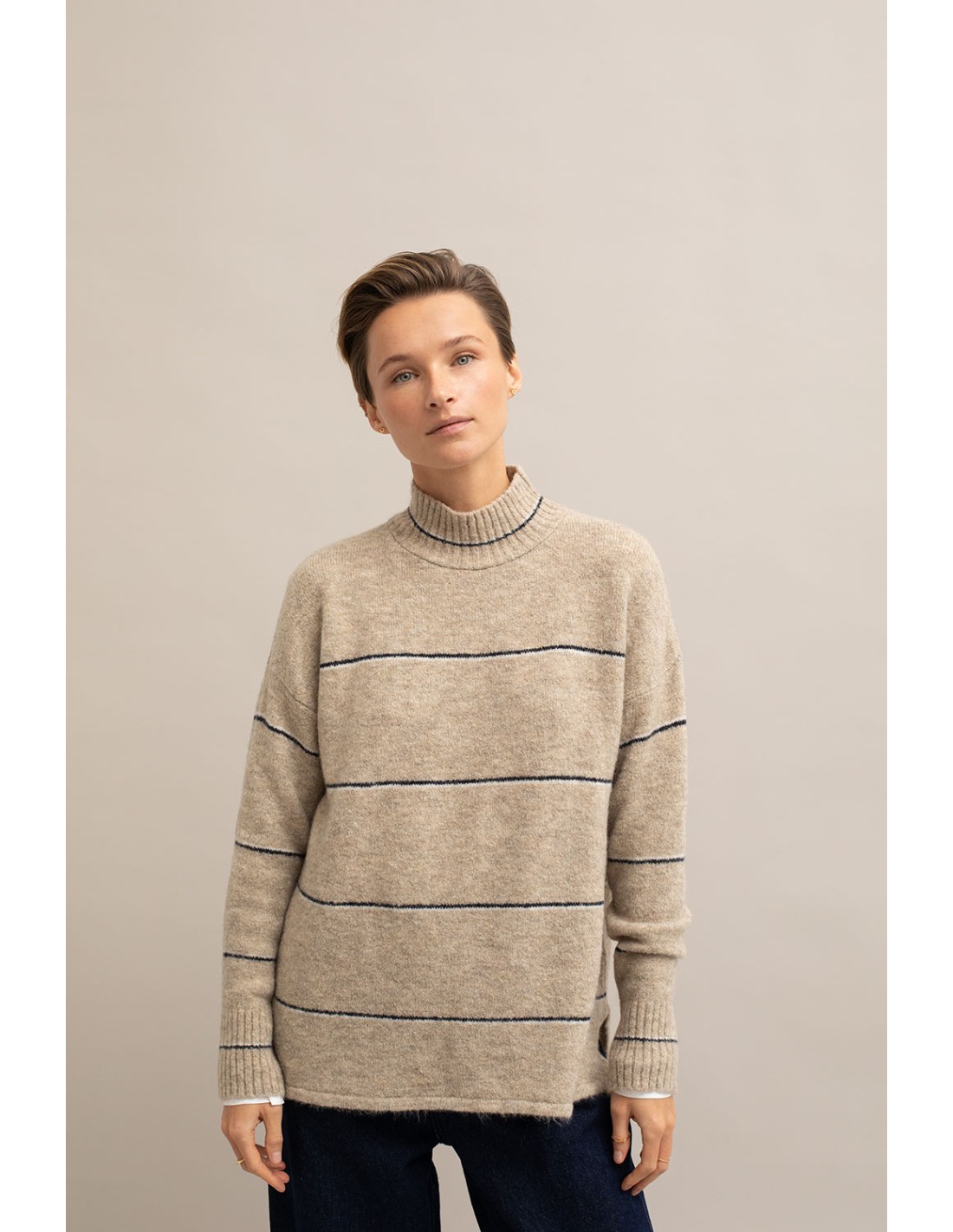 The Eume jumper features a perkins collar design with contrast piping, long sleeves and side slits, offering a combination of contemporary styling and distinctive figure-enhancing detailing.