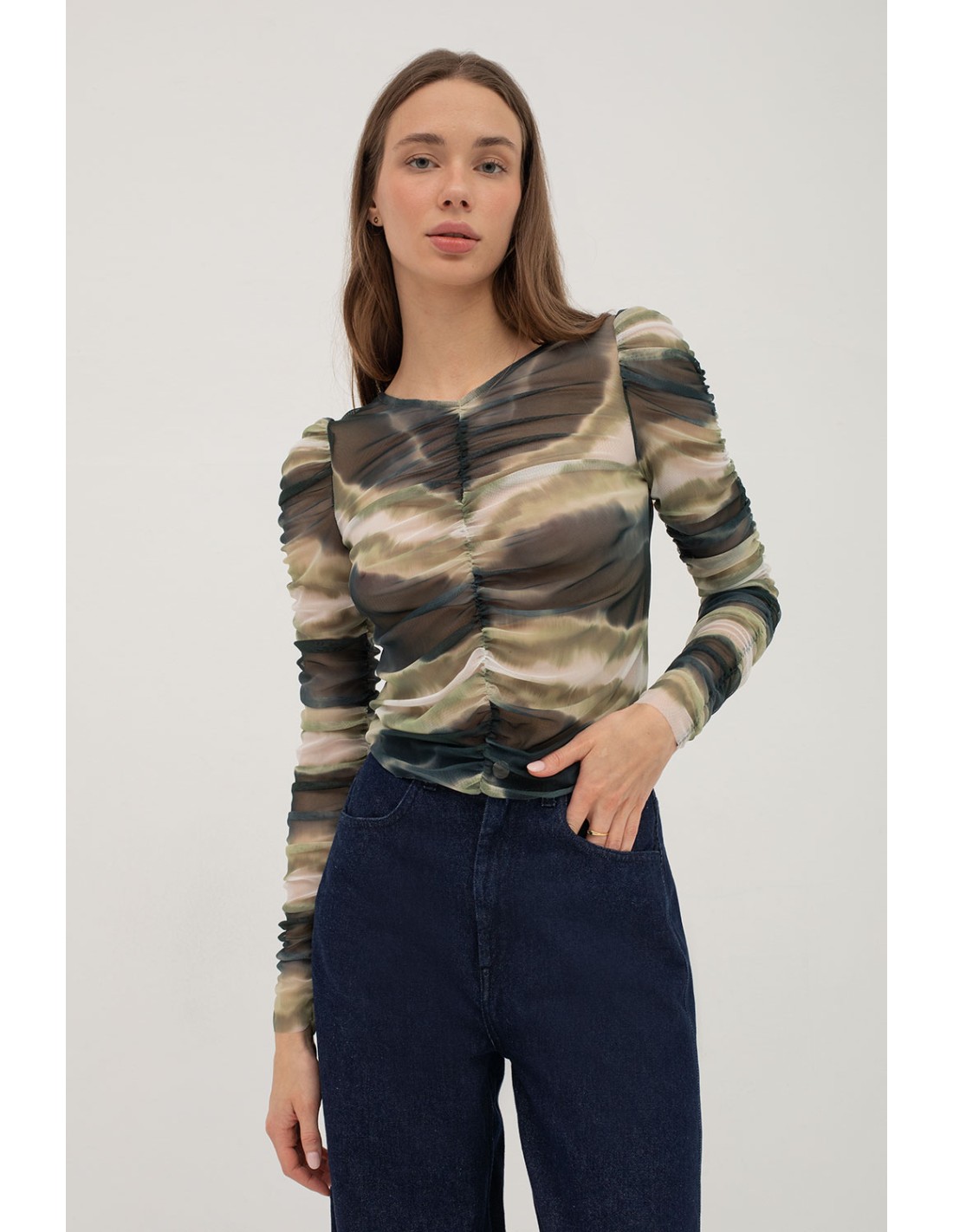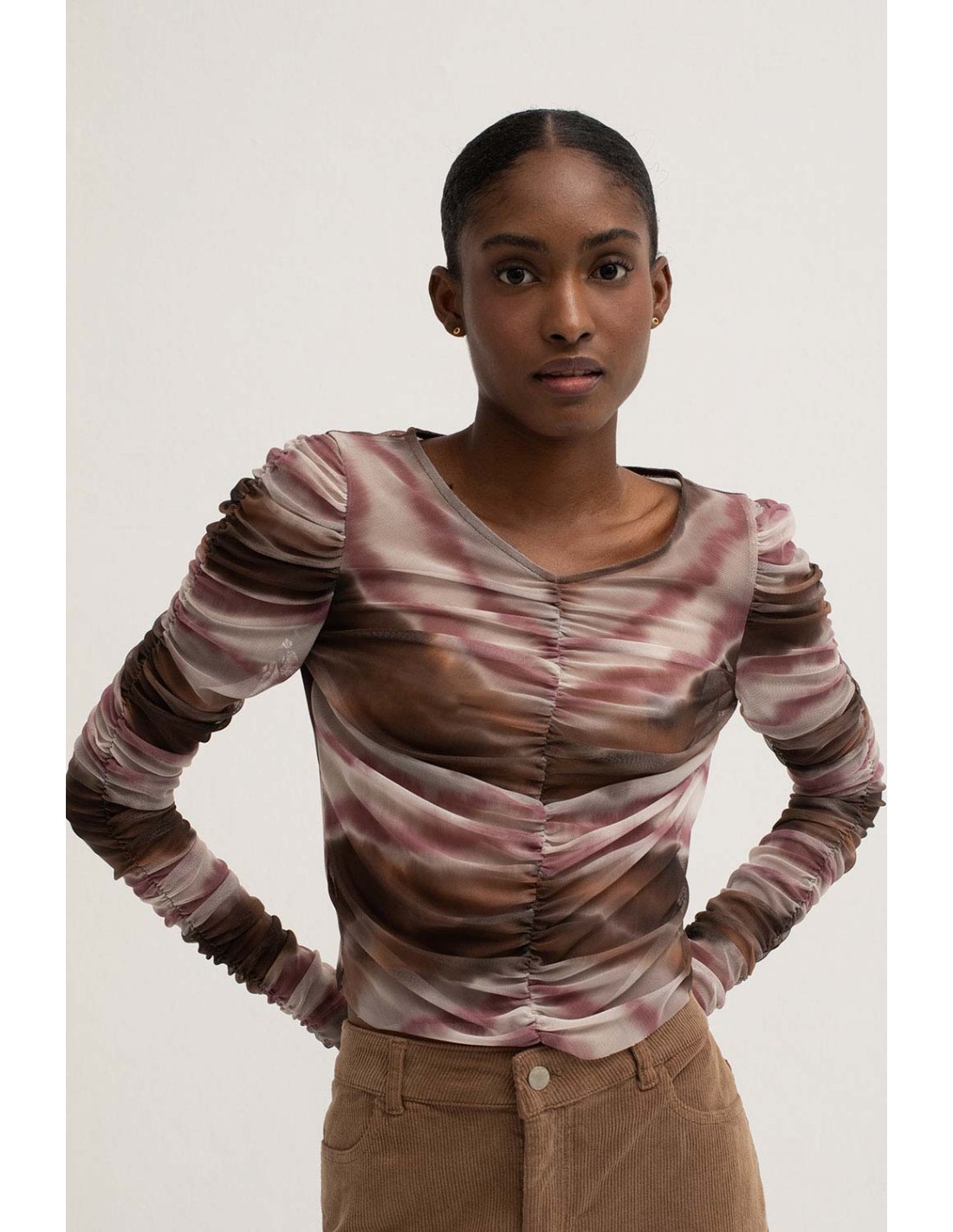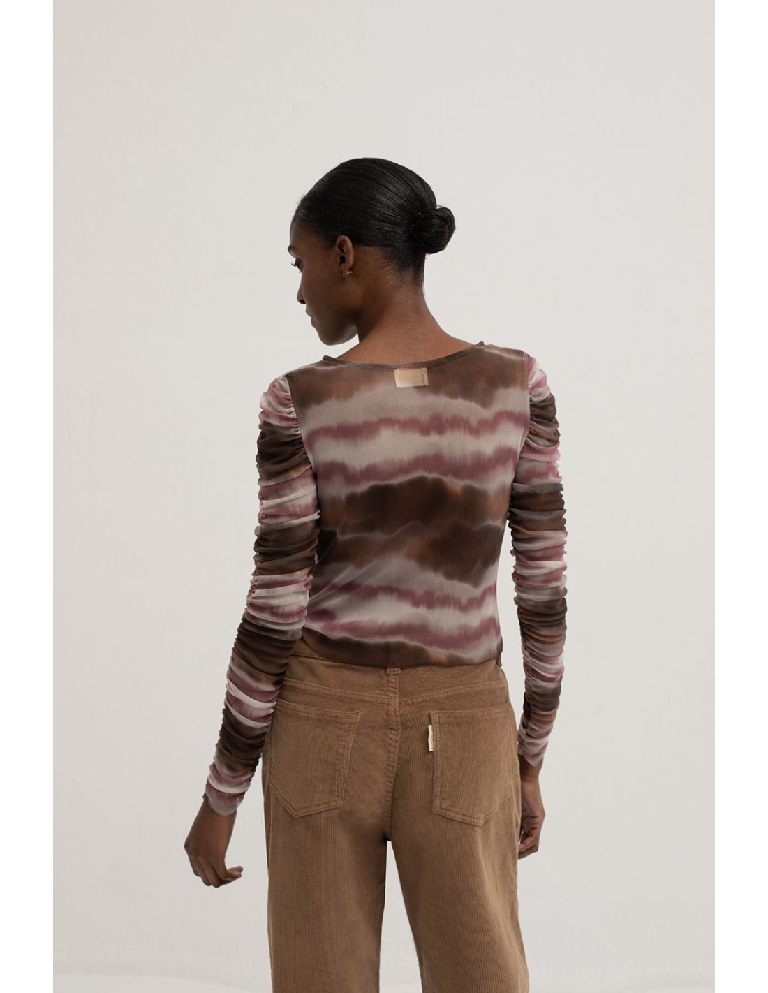 The printed tulle T-shirt features a ruffled front and sleeves, a flattering V-neckline and an unruffled back. We recommend you to combine it with the Mazie tulle skirt or the Murray dress!
