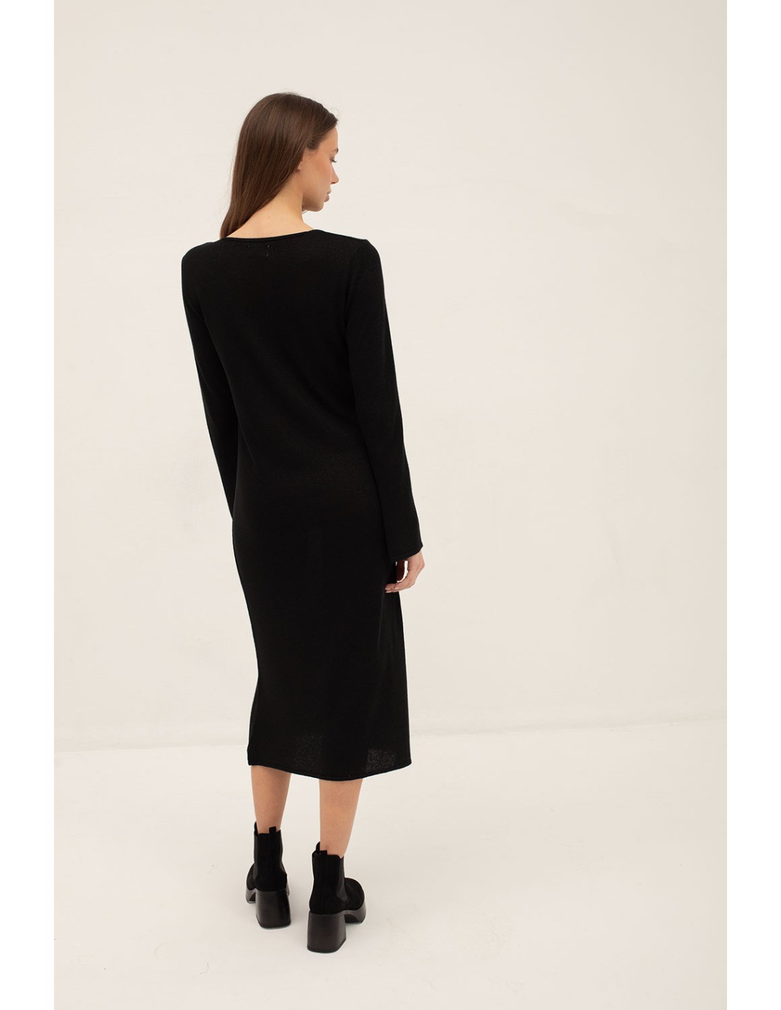 The Tietar dress is a long length lurex tricot dress, which features a side slit and a neckline with teardrop detail, providing an elegant and sophisticated style.