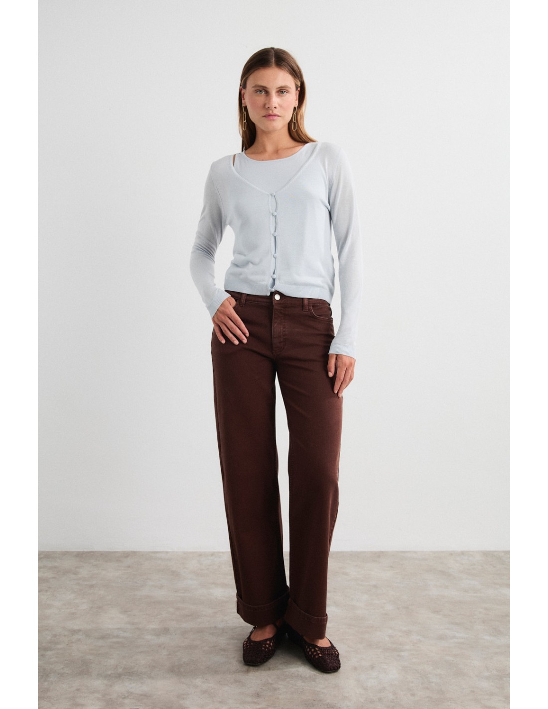 Short cardigan with long sleeves and V-neck, with lined button fastening for a delicate finish. It belongs to the soft and versatile Yakira family, along with the jumper and top in the same yarn.