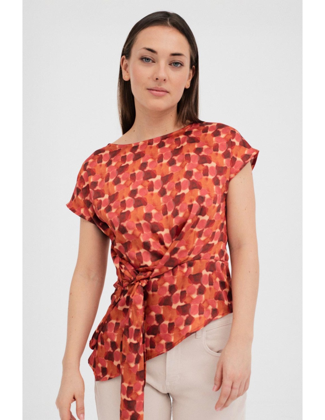 The Saude top is printed, with drop sleeves, boat neckline with button and teardrop on the back. Its laced waist and uneven hem make it perfect for a unique look. It goes with Sagene.
