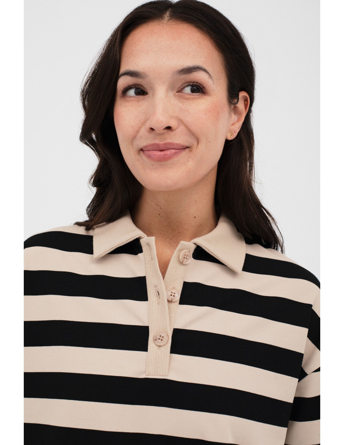 Pedralbes is a long-sleeved polo shirt with wide stripes. With a ribbed collar and placket in the same tone. Ideal for a casual look.