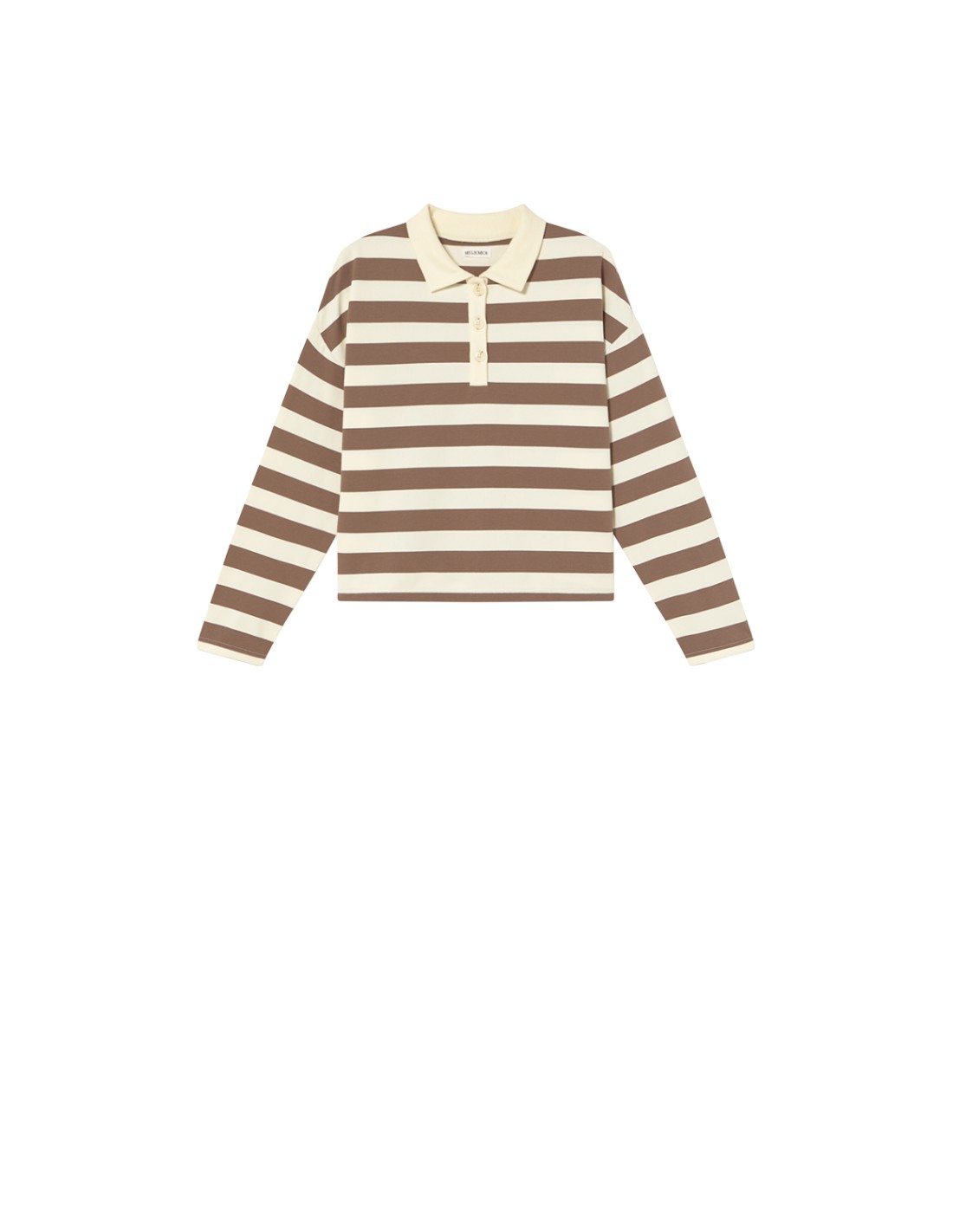 Pedralbes is a long-sleeved polo shirt with wide stripes. With a ribbed collar and placket in the same tone. Ideal for a casual look.