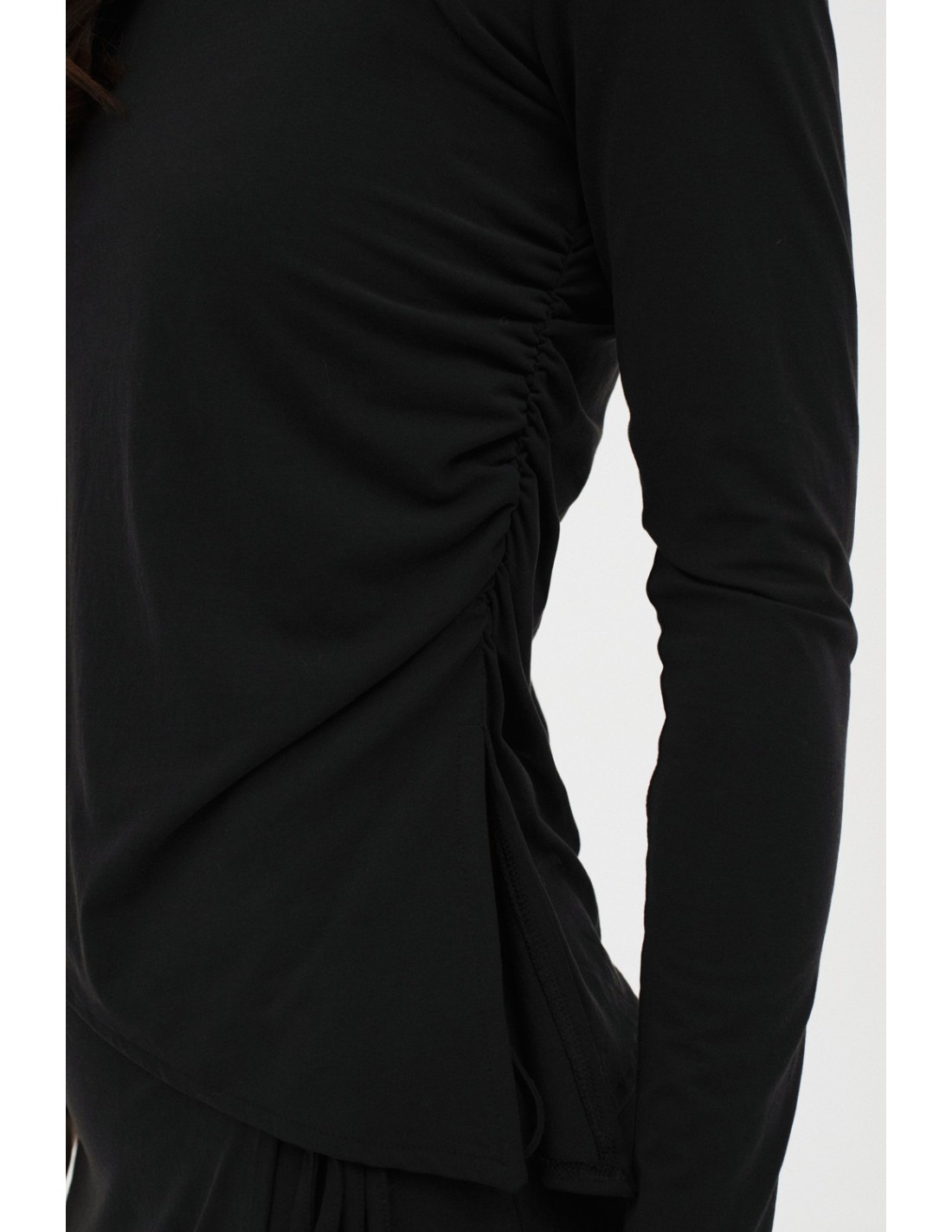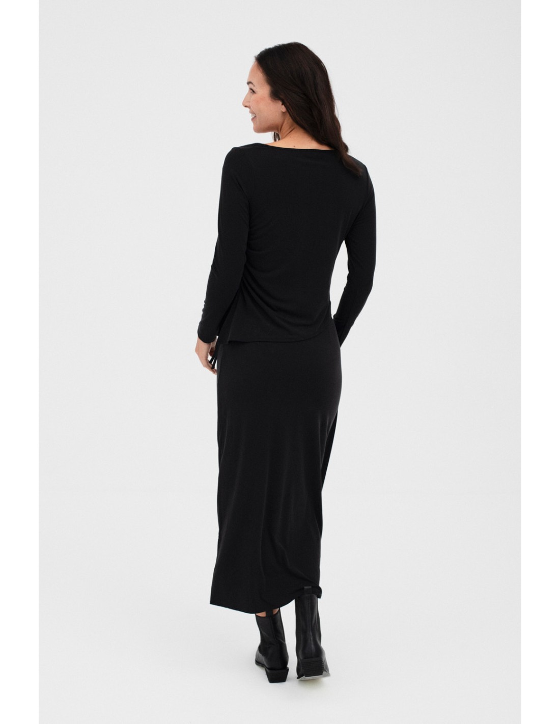 Staten is a long-sleeved T-shirt with a cupro effect. It features an asymmetric neckline, side slit and delicate pleat. Combine it with the Spital skirt for a modern and elegant look.